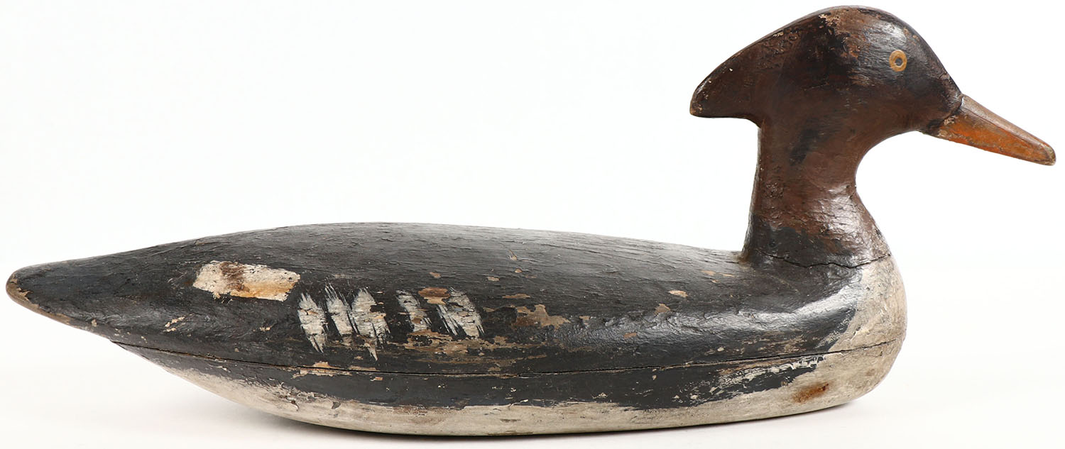 RARE Hooded Merganser Hen by Owen Ridgeway, Barnegat, NJ, PE, hollow wood, orignal paint, body is made of 2pc construction, nice early decoy, 15 1/2'' OAL. Grade> Excellent - Value: 30 to 90
