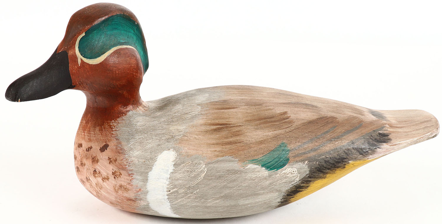 Greenwing Teal Drake by F.C.B. Jr, 1977, no eyes, hollow wood, original paint, 10'' OAL. Grade: Excellent - Value: 20 to 60