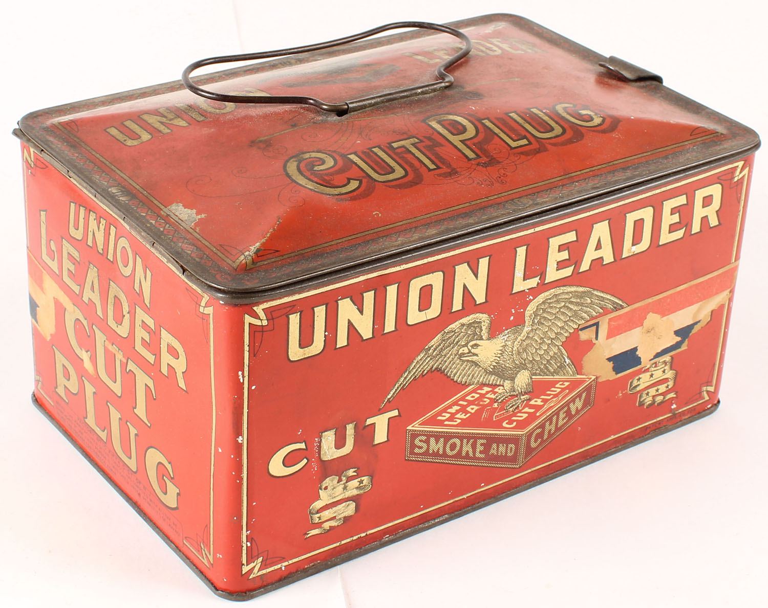 Large metal tobacco tin Empty, Union Leader. Grade: Very Good ++ - Value: 10 to 50