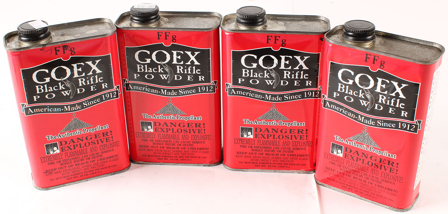 Lot of 4 Goex powder cans, all FULL. Grade: Excellent ++ - Value: 20 to 200