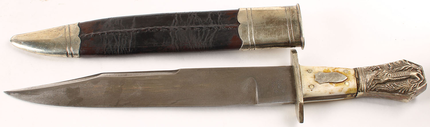 RARE! EARLY! ''Rodgers Sheffield'' Bowie Knife, full hilt, horn handle, 10'' blade, has orignal leather and metal sheath!, Still very solid. Grade: Excellent - Value: 400 to 1000