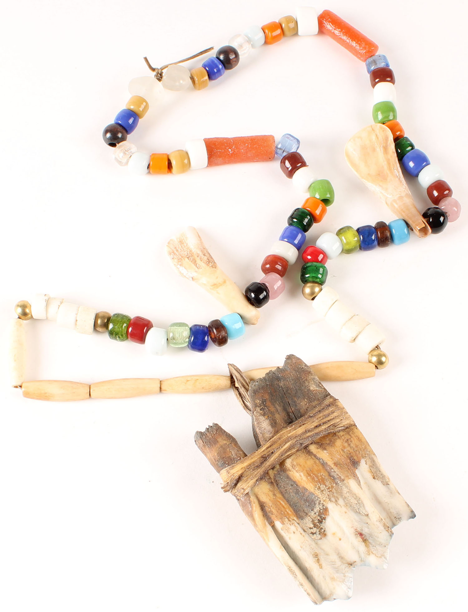 RARE extinct Bison Tooth necklace with many glass, bone, brass trade beads and Bison teeth. Sinew wrapped from the late Edward Emille Dorssom estate. Collected in the 1940's. Grade: Very Good ++ - Value: 80 to 300