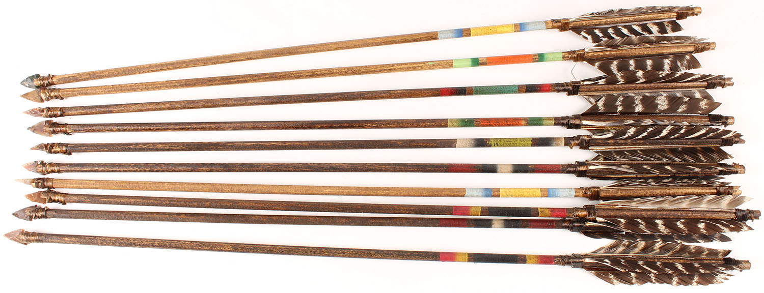 Large lot of handmade Native American arrows, flint tip with bird feathers and well made! Grade: Excellent - Value: 100 to 200