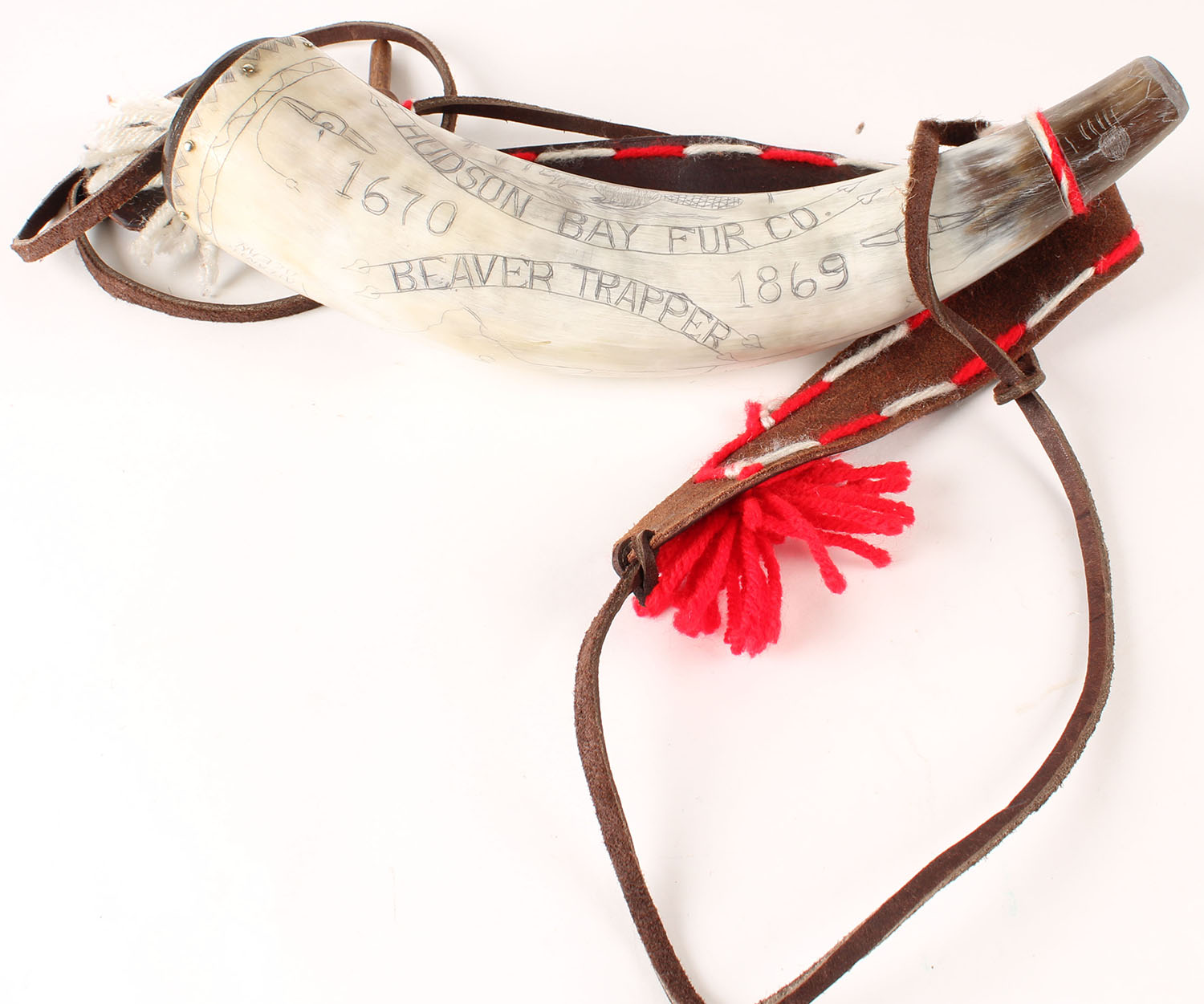 Antique intricately designed powder horn, Hudson Bay Fur Co. 1670-1869, 11'' OAL, very solid and clean, with leather sash. Grade: Excellent - Value: 40 to 200