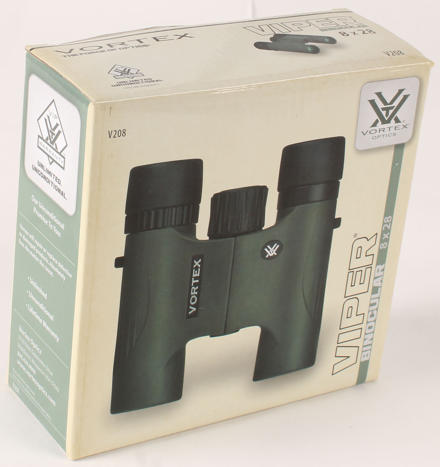 Vortex, Viper, 8x28 Binocular, NIB, comes with carrying case, neck strap, rain guard eyepiece cover, tethered lens covers, and lens cleaning cloth. Grade: MINT - Value: 100 to 300
