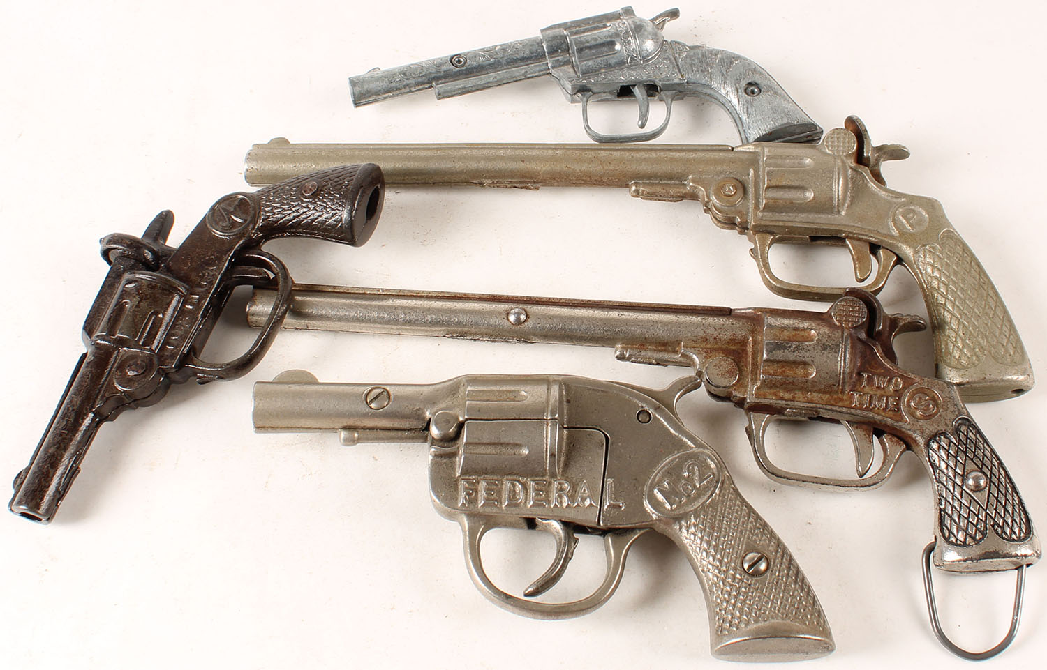 Lot of 5 Vintage Cap pistols, marked Federal No. 2, National, Two Time S W, P, unmarked. Grade: Very Good - Value: 20 to 150