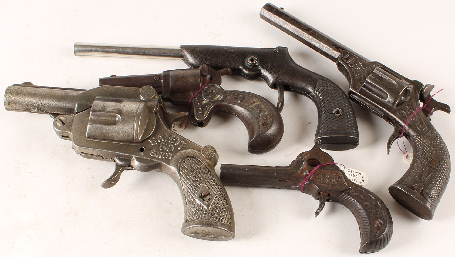 Lot of 5 Vintage Cap pistols, marked Liberty, 1880, 1876, Safety 50 Shot, unmarked hammerless cast iron. Grade: Very Good - Value: 10 to 150