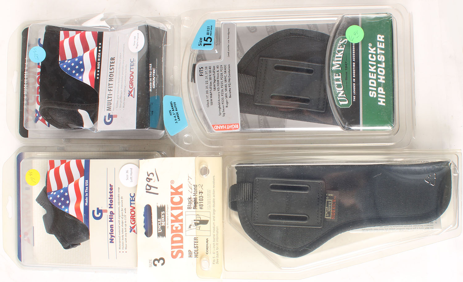 Lot of NIB pistol holsters in the original packaging, see photo for more details. Grade: MINT - Value: 2 to 40