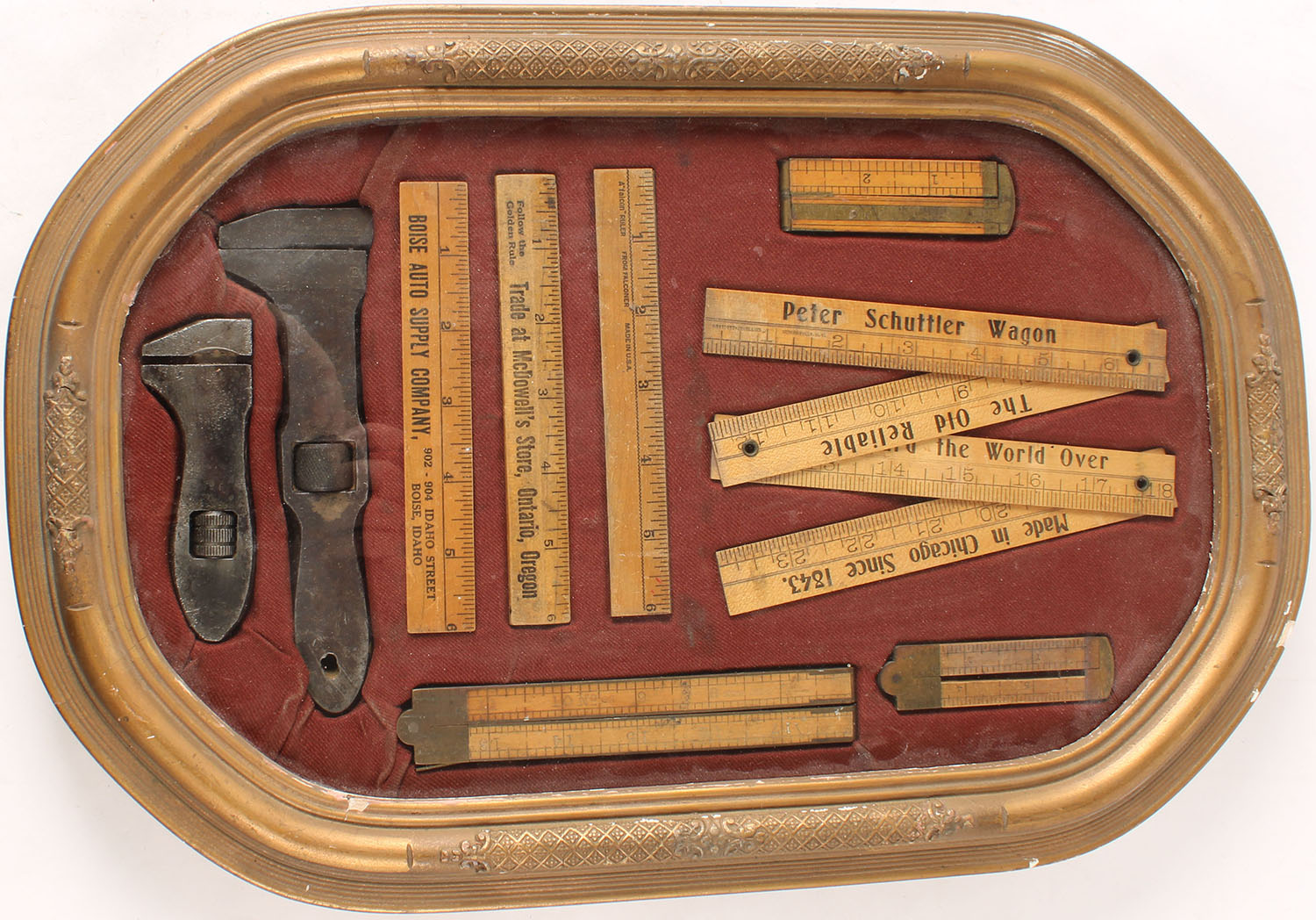 Early carpentry tools with many fold out rulers, Billings & Spencer bicycle wrenches, framed under glass. Grade: Excellent - Value: 30 to 250