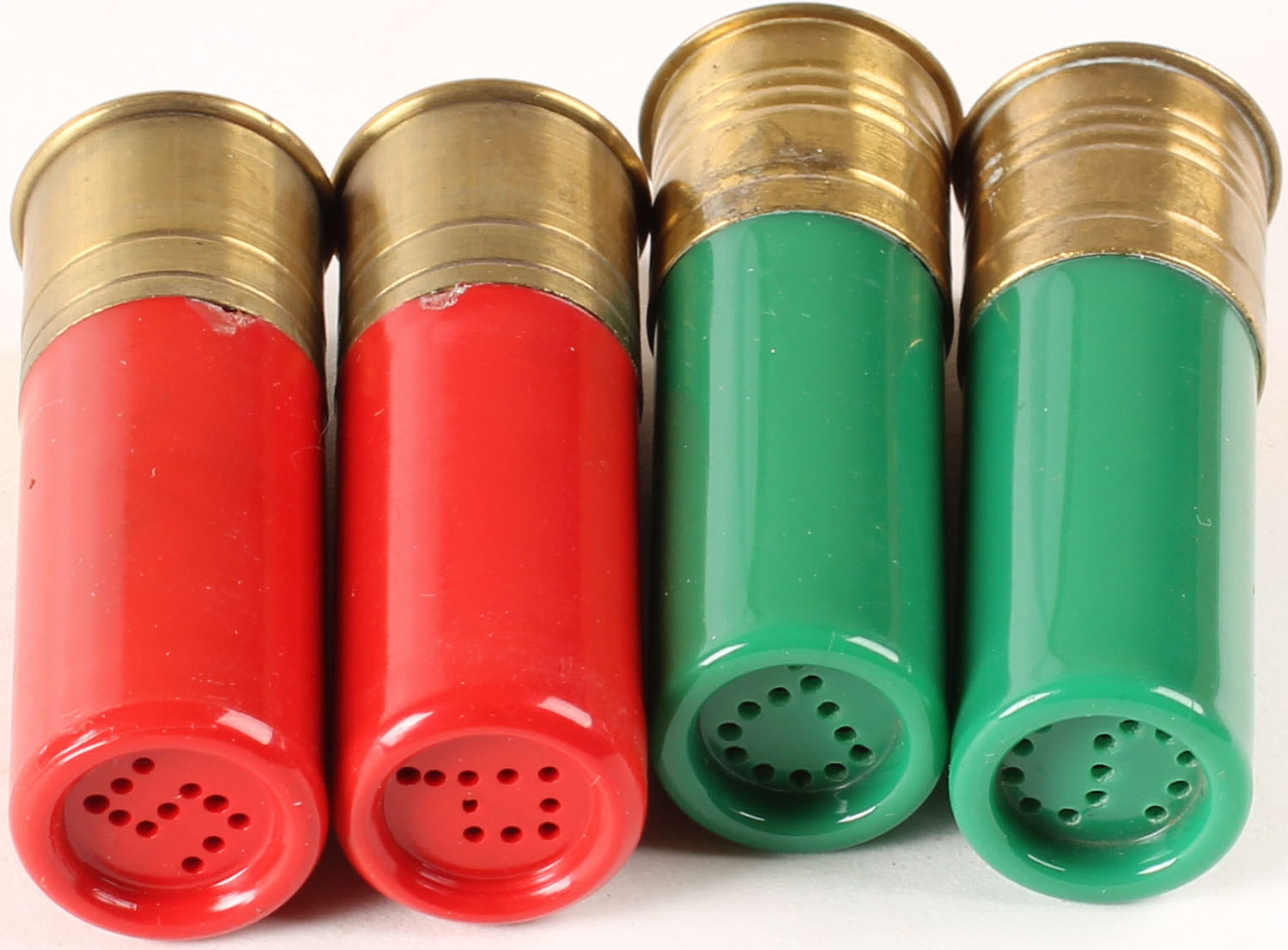 Lot of 2 sets of Salt & Pepper shakers in the shape of shotshells, red & green. Grade: Excellent - Value: 6 to 30