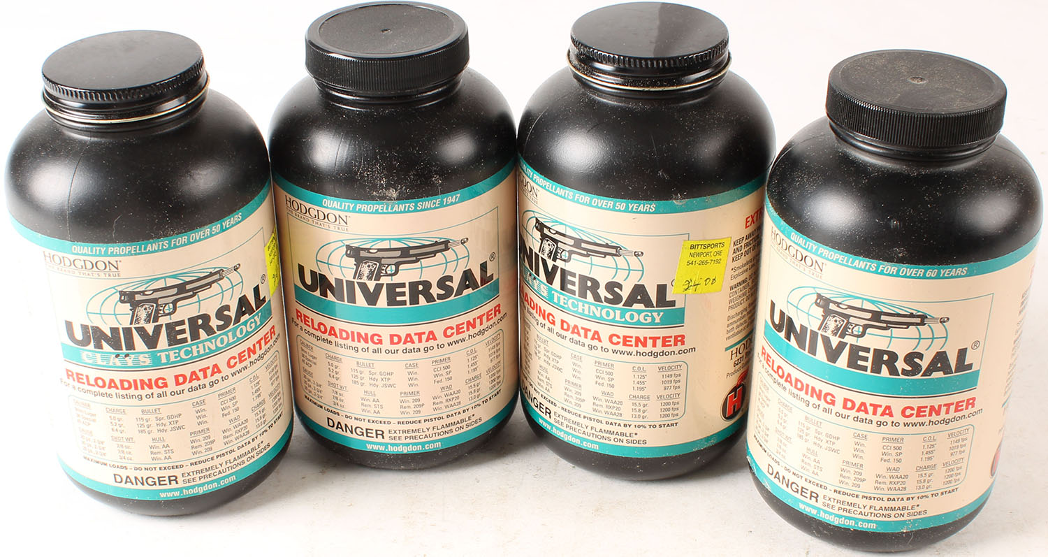 Universal, Lot of (4) 1lb bottles of Pistol Powder, Smokeless Powder, all bottles are full or mostly full. Grade: Excellent - Value: 20 to 100