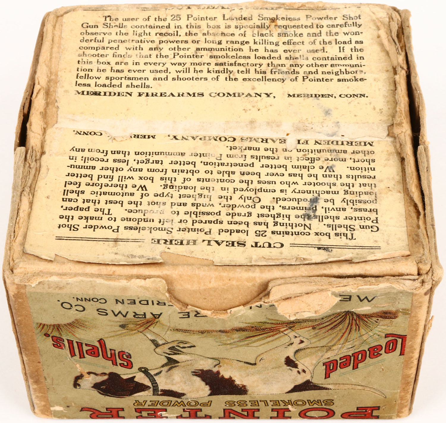 Meriden Firearms Co., POINTER, 16ga, 2pc., Empty, shot size 4 correct bottom, buff box with multi colored label pictures hunting scene on top, two crossed shells on one side & pointing dog on the other side, box has age soiling & tape repair with a seam split, label is nice. Grade: Very Good + - Value: 150 to 400