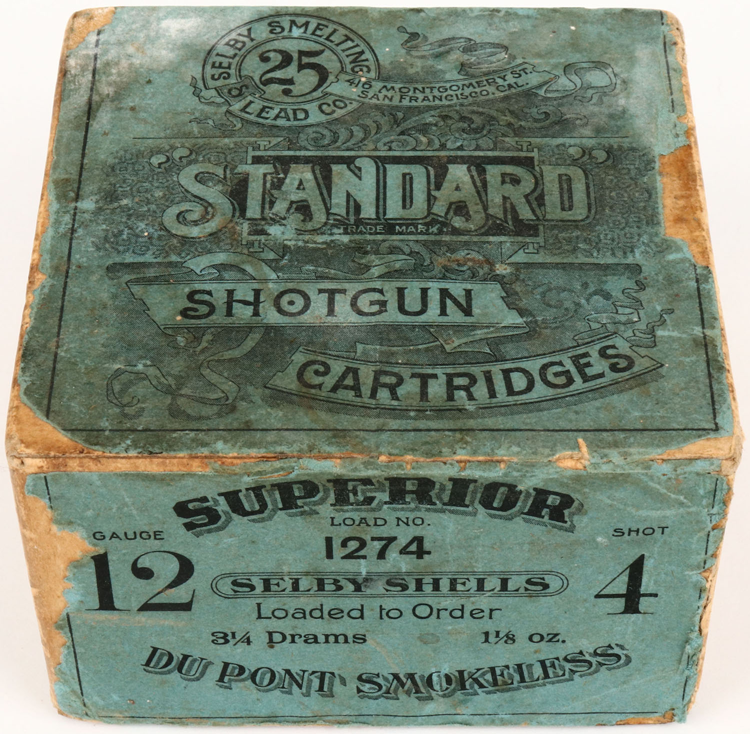 SELBY SMELTING & LEAD Co., STANDARD, 12 GAUGE, 2pc., Empty, SUPERIOR, Loaded To Order, 1 1/8 oz., No. 4, buff box with black and green label, box is very solid, with light age soiling & label is 93% intact. Grade: Excellent - Value: 70 to 300