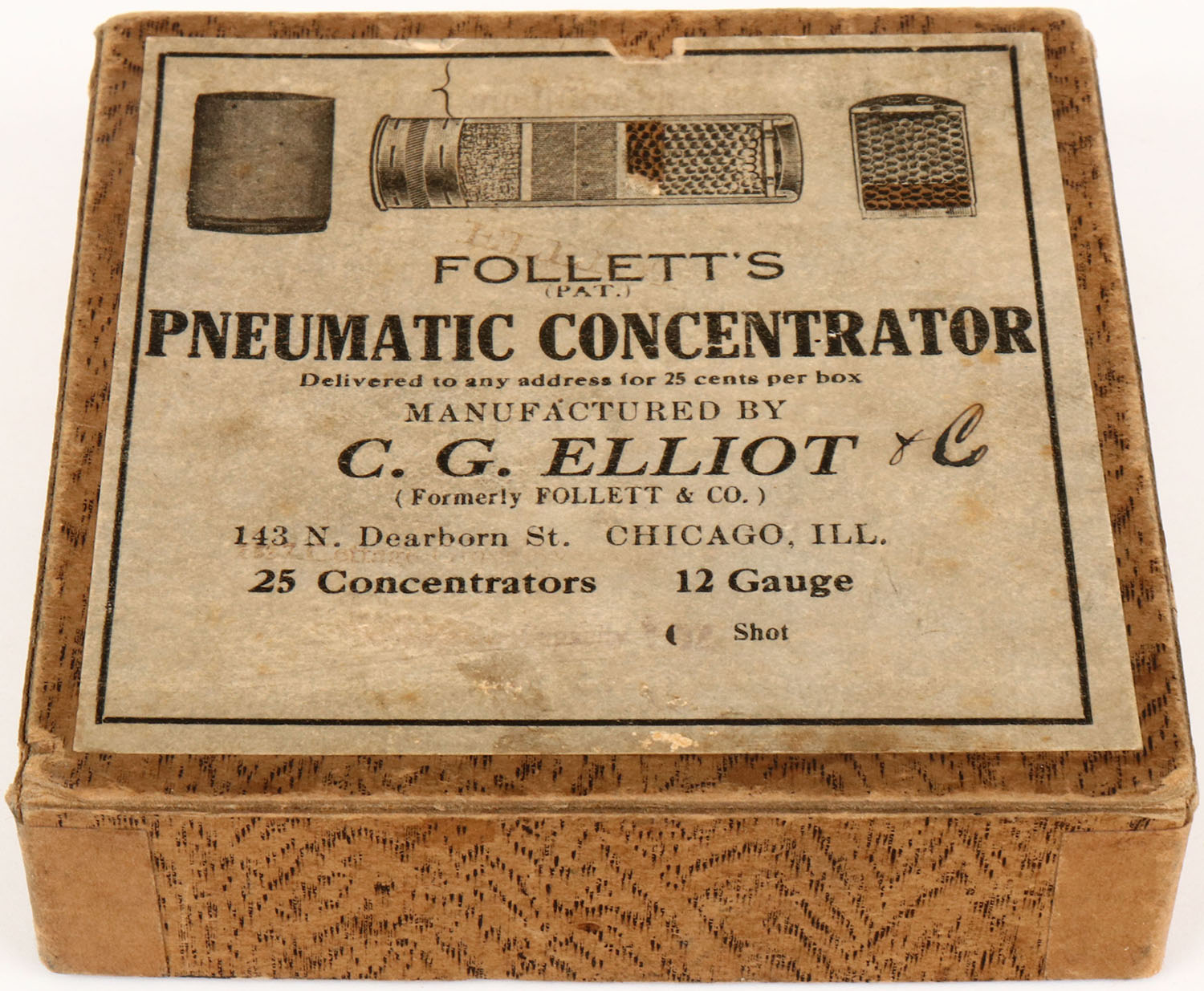Follett Manufacture, Box contains 24 cylindrical paper containers with a brass end, Box also contains cork wads for under the concentrator, there are wads for use in front of the concentrator with four holes to catch the air and blow away. Grade: Excellent - Value: 10 to 50