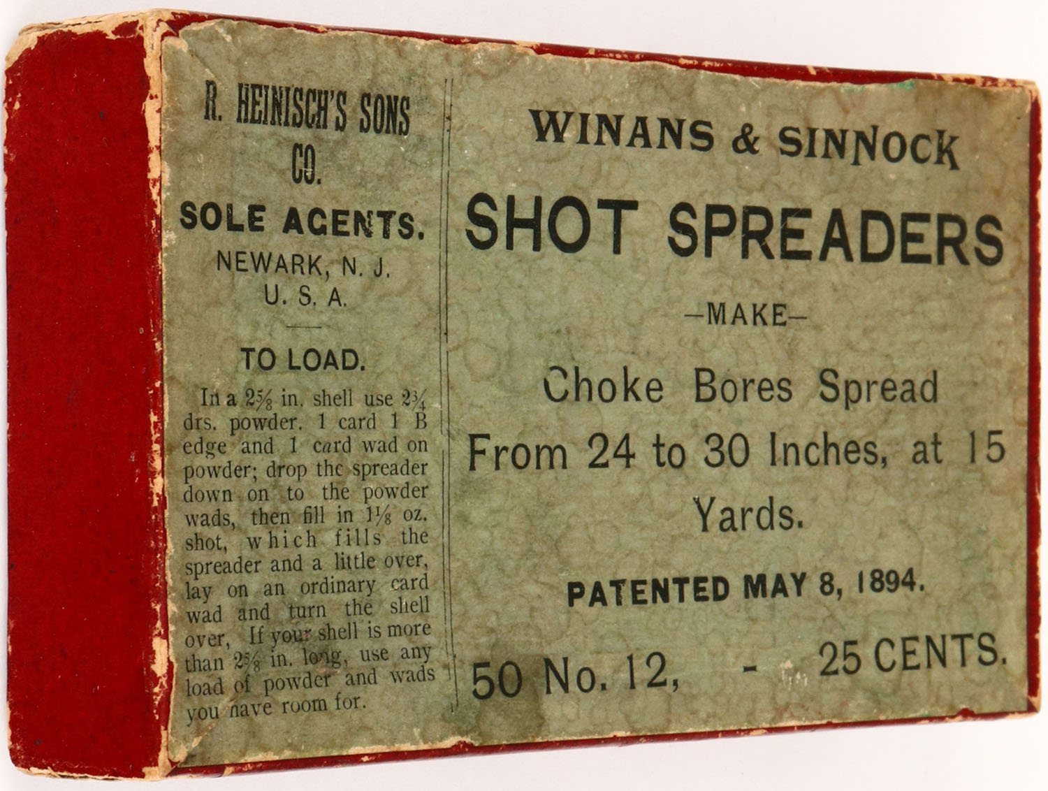 R. Heinisch's Sons CO., Winans & Kinnock. Shot Spreaders 22 count, box is solid with edge wear and light age soiling with good label. Grade: Excellent - Value: 10 to 50
