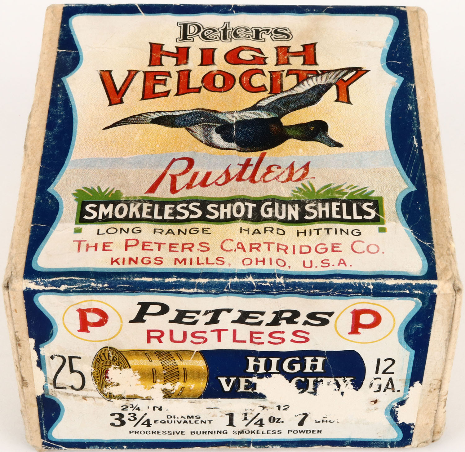 Peters Cart. Co., Blue Bill, 12ga., 2pc., Empty, shot size 7CH shot, buff box with multi colored label that pictures Blue Bill in flight, box has scuffing, light soiling & box is solid with very good colors. Grade: Very Good ++ - Value: 50 to 200