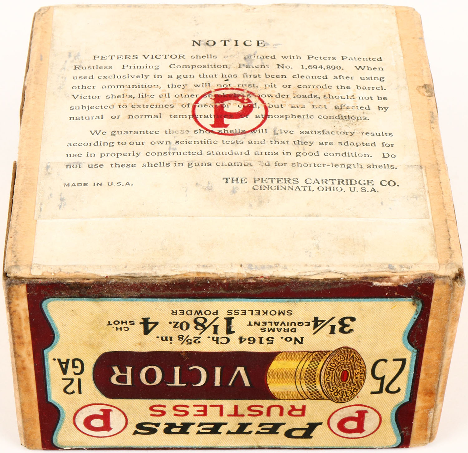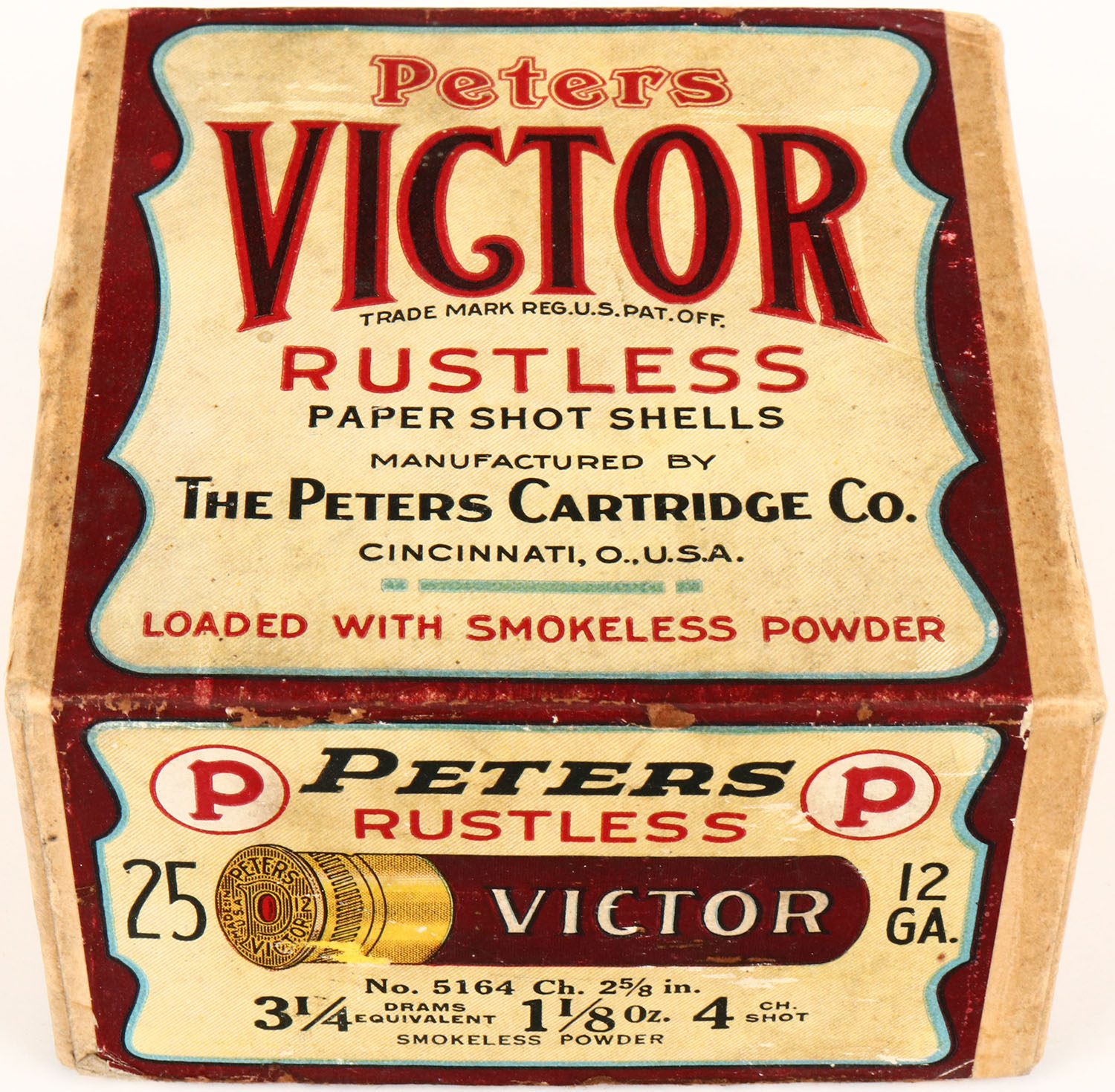 Peters Cart. Co., Victor, Rustless, 12ga., 2pc., Partial 24rds, shot size 4CH, 2 5/8'' buff box with brown, cream & black label, box is solid, with light age soiling, Shells are very good. Grade: Excellent + - Value: 20 to 60