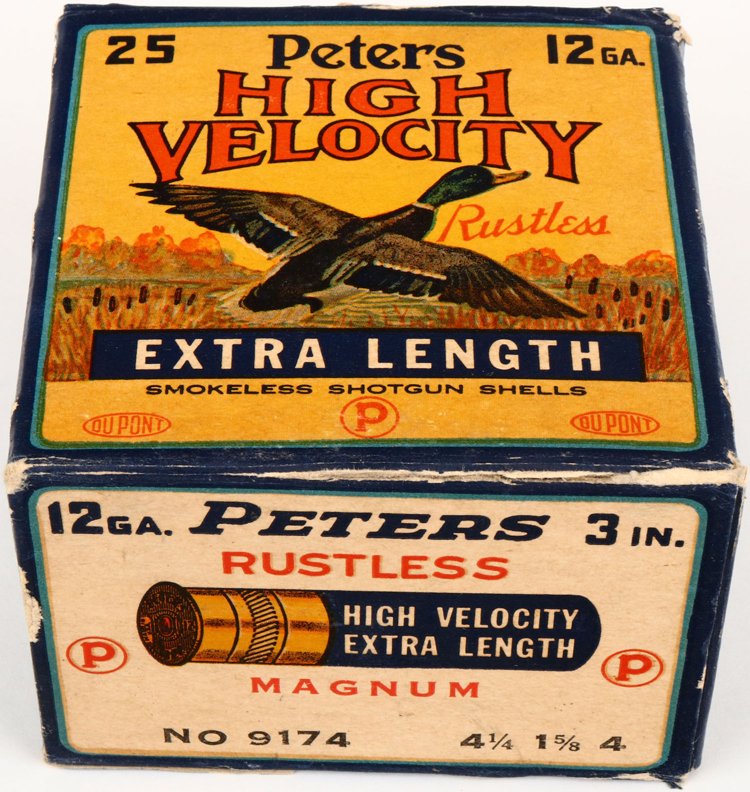 Peters Cart. Co., Bridgeport, CT, High Velocity, Extra Length 12ga. 3 in, Magnum, 1pc., Full, shot size 4, multi colored box that pictures mallard flying out of the marsh grass, has almost torn off top flap, edge wear with nice colors, shells are excellent. Grade: Excellent - Value: 50 to 200
