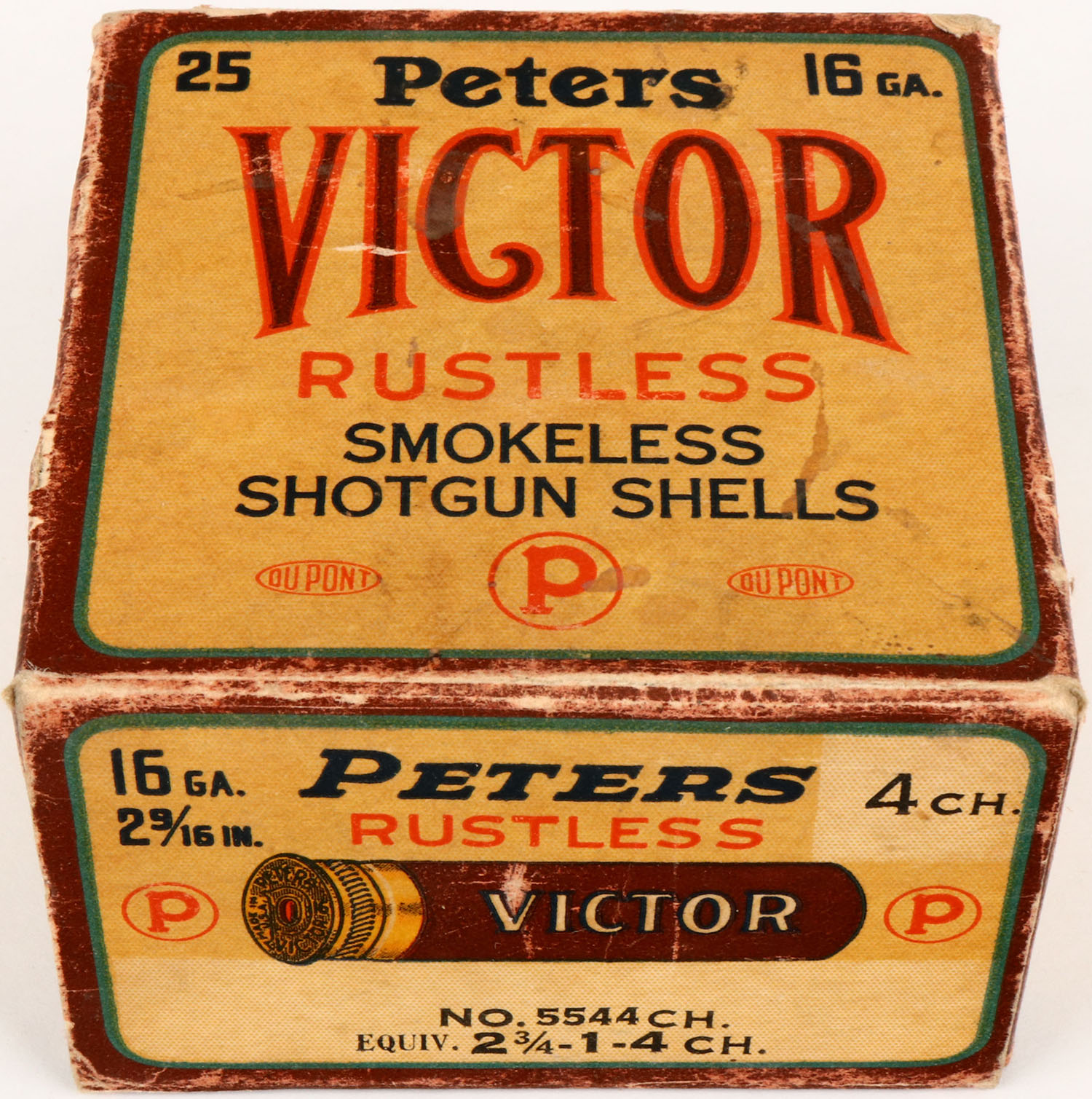 Peters, Victor, 16ga, 1pc., Full with 6 being incorrect shot size, shot size 4 CH, Maroon, cream & orange box, 2 9/16'', box has light edge wear and very nice colors. Shells are excellent. Grade: Very Good ++ - Value: 20 to 50