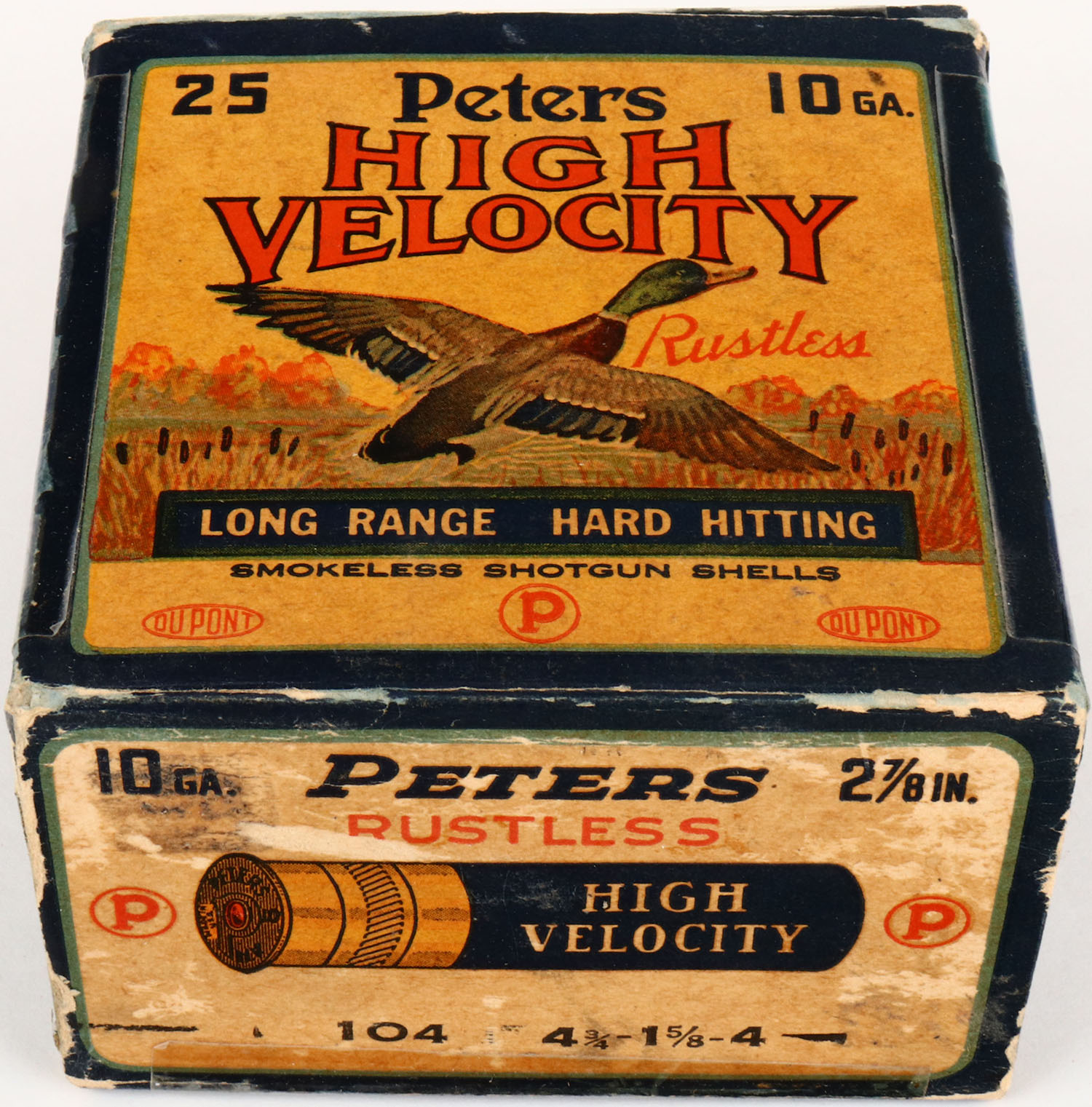 Peters Cart. Co., Bridgeport, CT, High Velocity, 10ga., 1pc., Full, shot size 4, multi colored box that pictures mallard flying out of the marsh grass, box has light edge wear with tape repairs and light age soiling but good color, shells are excellent. Grade: Very Good ++ - Value: 20 to 80