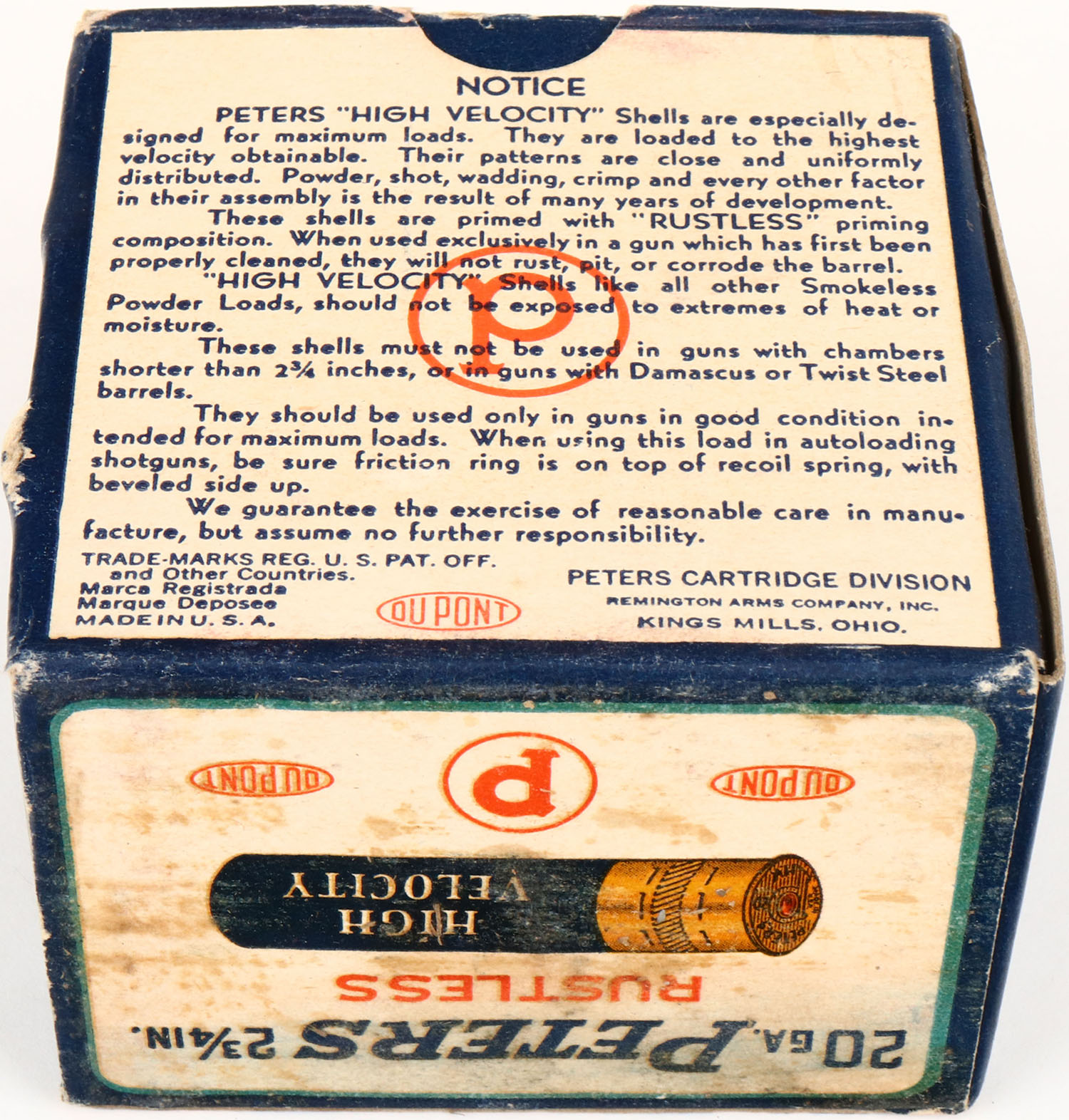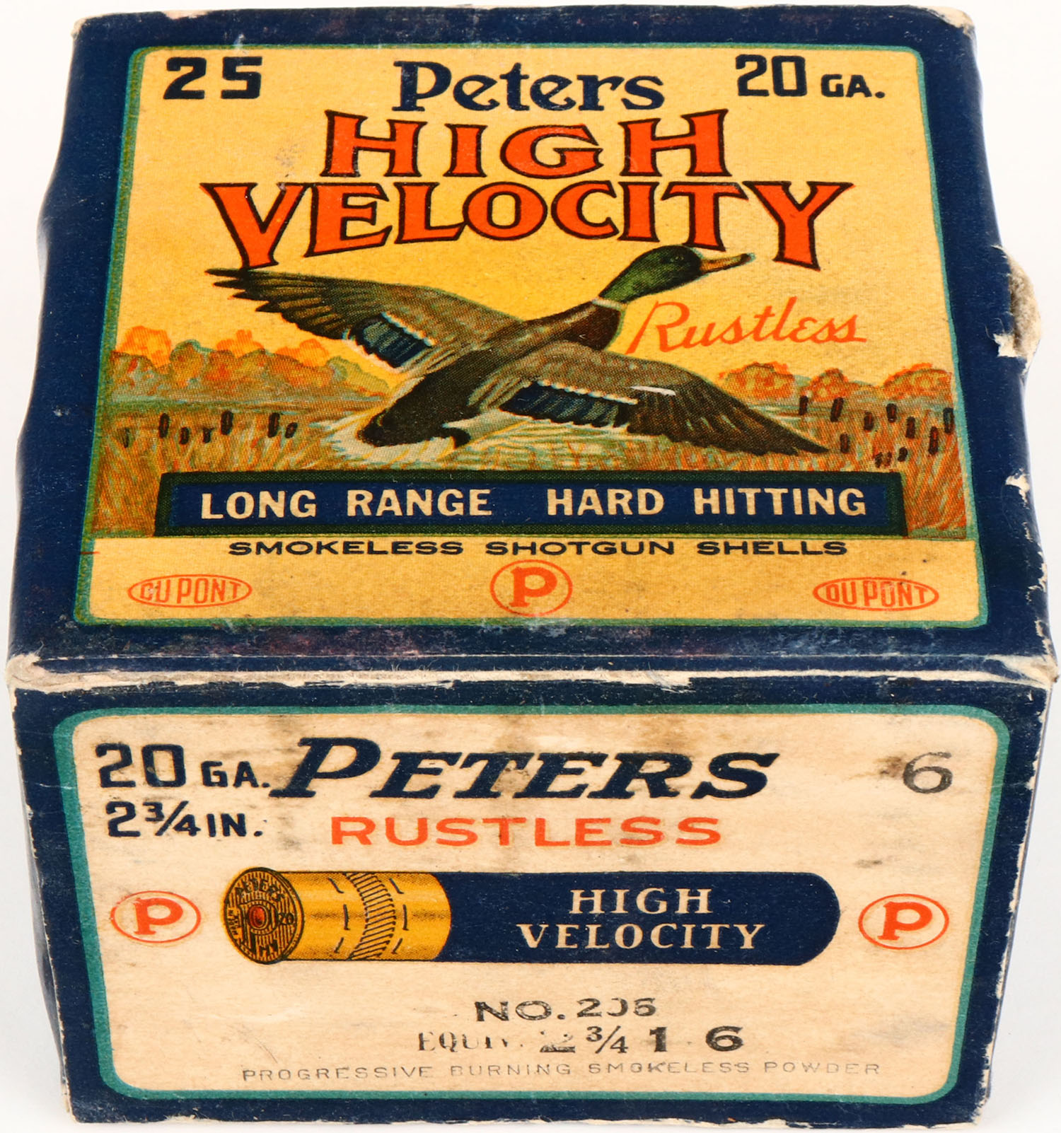 Peters Cart. Co., Kings Mills, OH, High Velocity, 20ga., 1pc., Full, shot size 6, multi colored box that pictures mallard flying out of the marsh grass, box is solid with light age soiling, shell protrusions, good color, shells are good. Grade: Very Good ++ - Value: 20 to 80