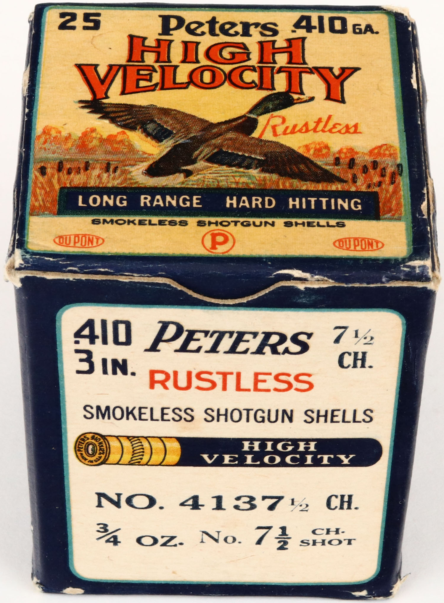 Peters, High Velocity, 410ga., 3 in., 1pc., Full, shot size 7 1/2CH, multi-colored box with mallard duck flying out of marsh grass, box is solid with great colors, Rare with duck on top flap, shells are excellent. Grade: Excellent + - Value: 20 to 100
