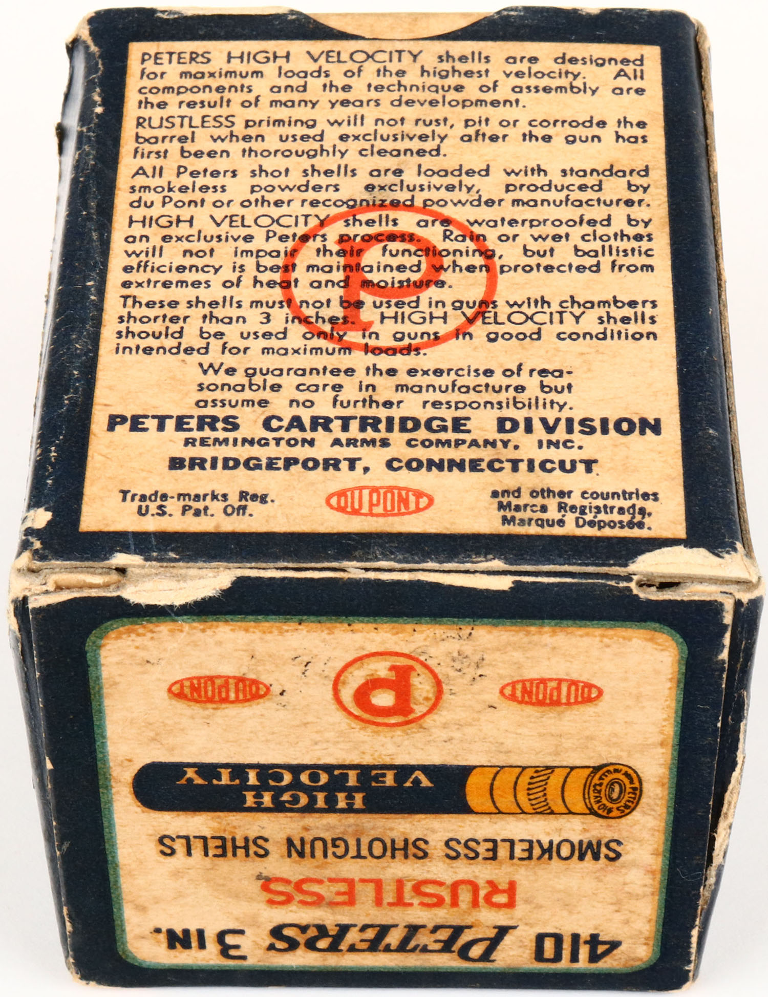 Peters, High Velocity, 410ga., 3 in., 1pc., Full, shot size 7 1/2, multi-colored box with mallard duck flying out of marsh grass, box has age soiling, edge wear with inside flap torn off, shells are excellent. Grade: Very Good + - Value: 20 to 80