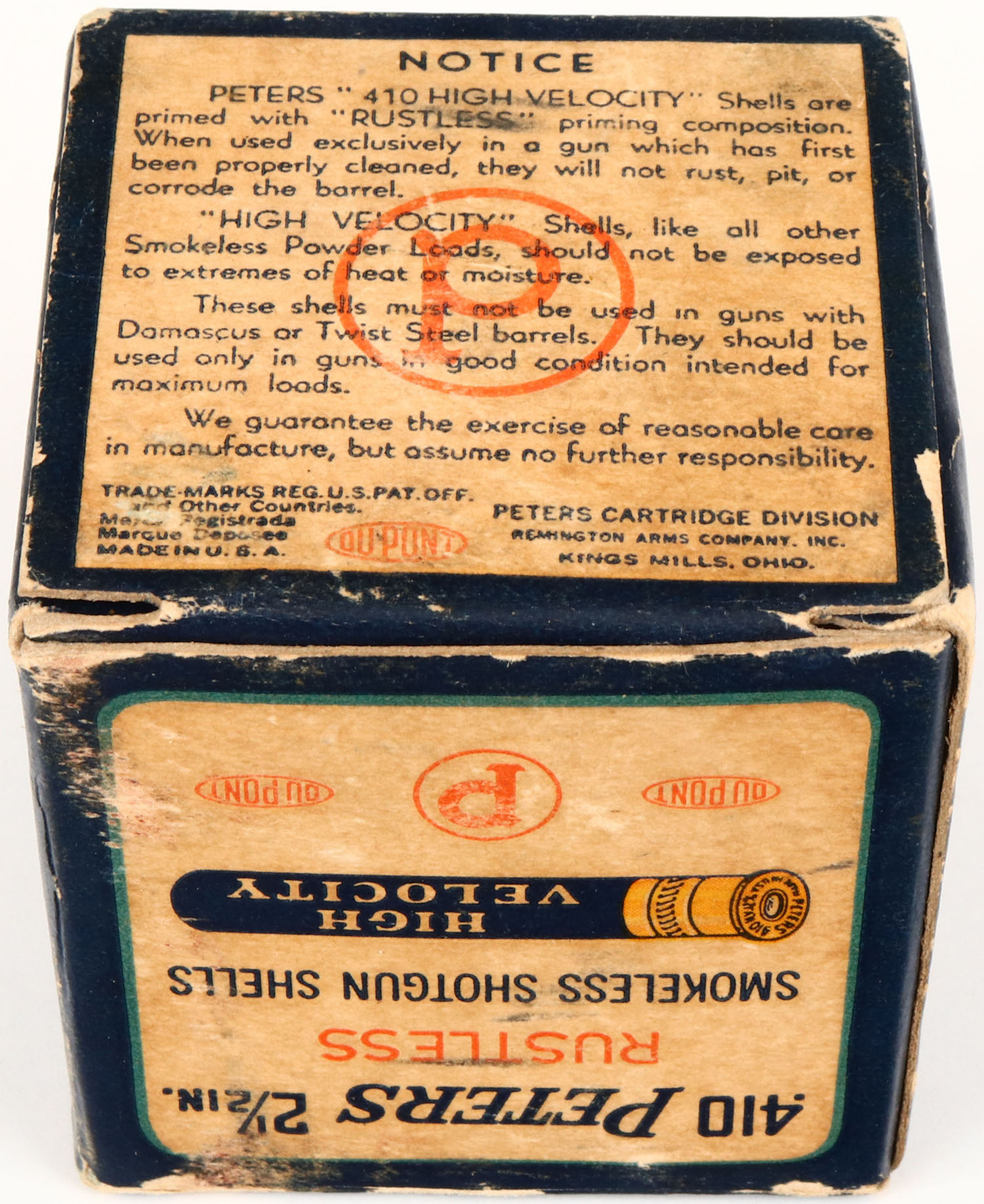 Peters, High Velocity, 410ga., 2 1/2 in., 1pc., Full, shot size 6CH, multi-colored box with mallard duck flying out of marsh grass, box is solid with age soiling, light edge wear, shells are excellent. Grade: Very Good + - Value: 20 to 100