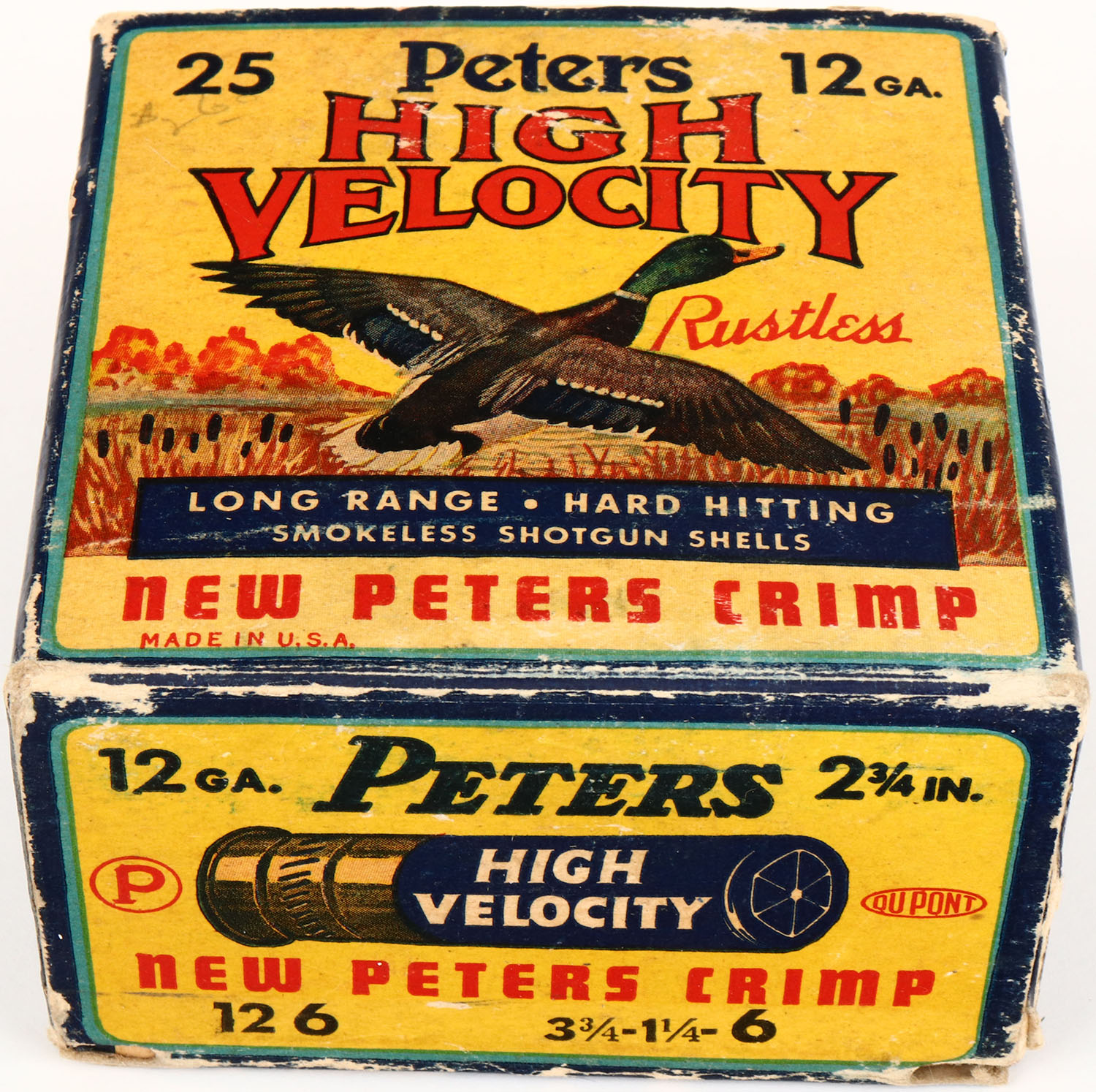 Peters Cart. Co., High Velocity, New Peters Crimp, 12ga., 1pc., Full, shot size 6, multi colored box that pictures mallard flying out of the marsh grass, paper shells, box is very solid with very nice colors & light edge wear, shells are very good. Grade: Very Good ++ - Value: 10 to 40