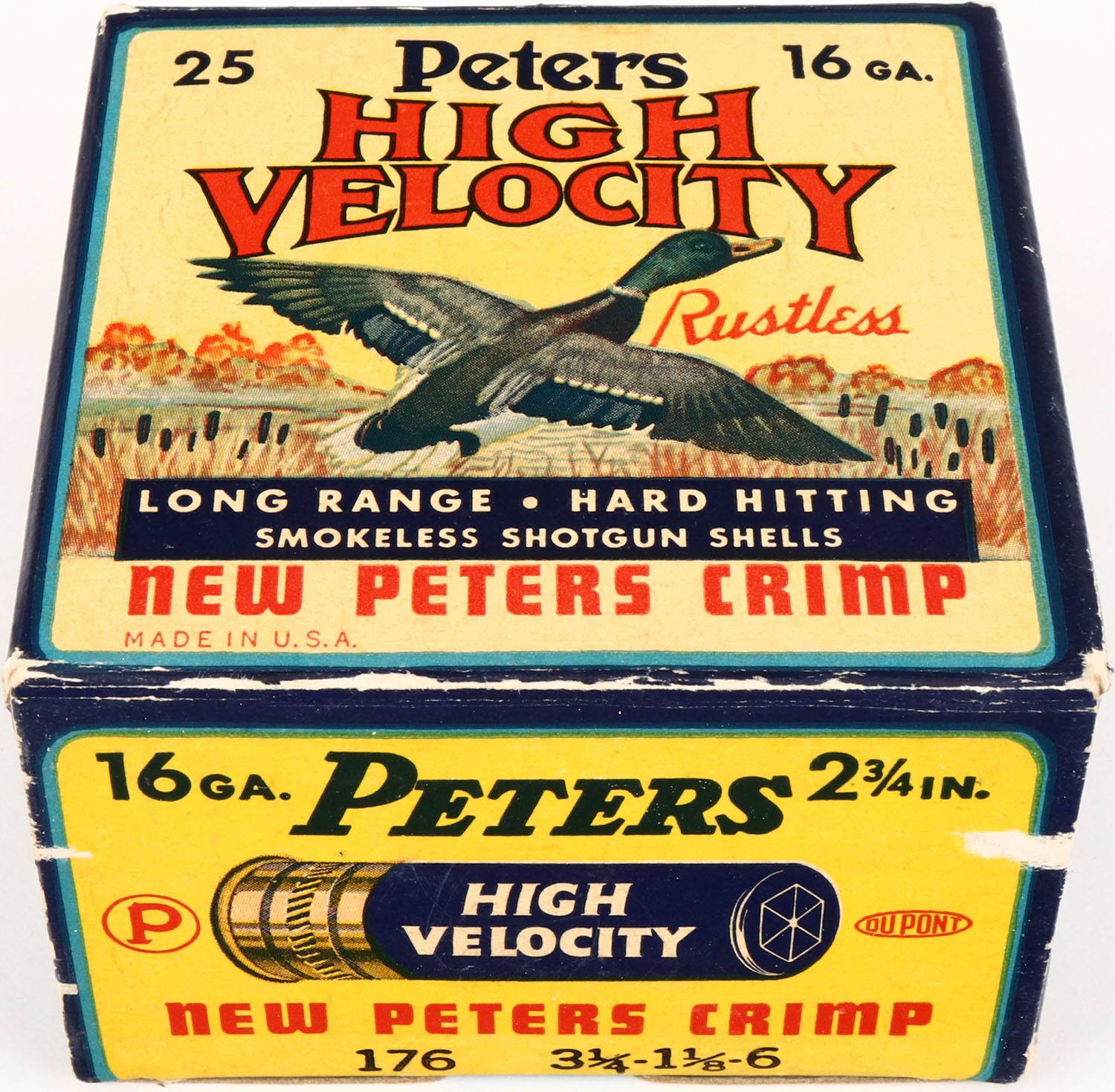 Peters Cart. Co., High Velocity, New Peters Crimp, 16ga., 1pc., Empty, shot size 6, multi colored box that pictures mallard flying out of the marsh grass, box is very solid with great colors. Grade: Excellent ++ - Value: 6 to 30