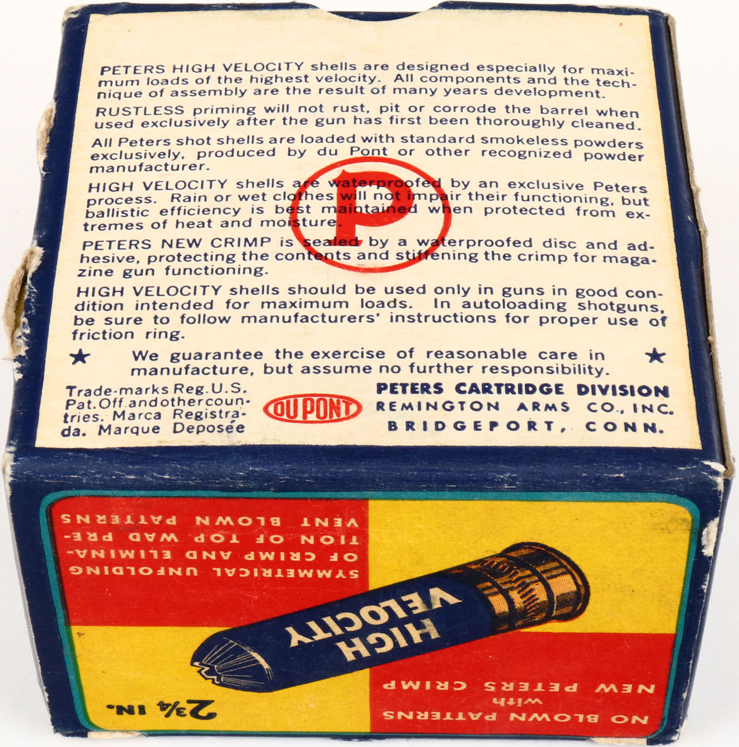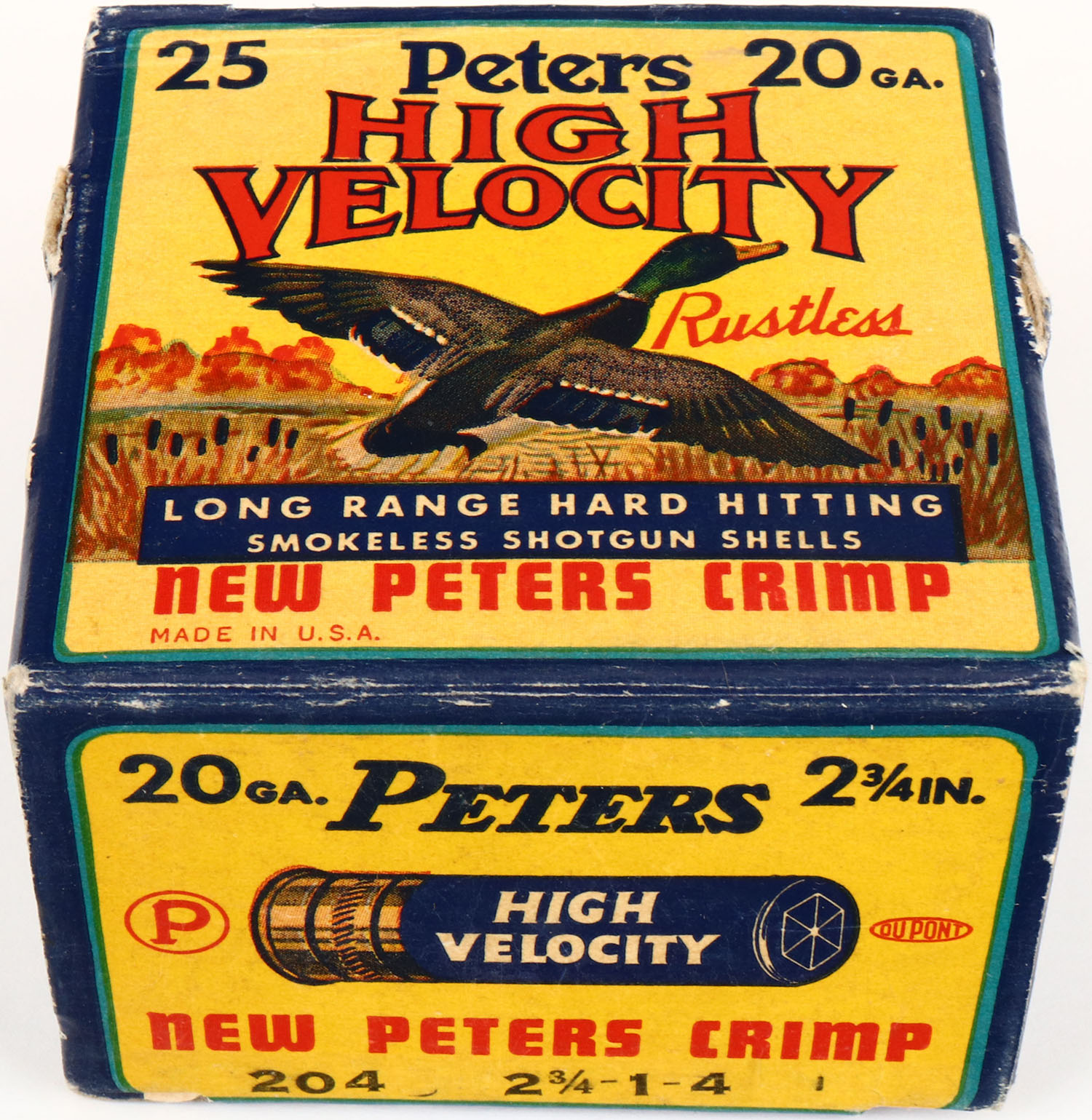 Peters Cart. Co., High Velocity, New Peters Crimp, 20ga., 1pc., Full, shot size 6, multi colored box that pictures mallard flying out of the marsh grass, paper shells, box is solid with shell protrusions and great colors, shells are very good. Grade: Excellent + - Value: 20 to 60