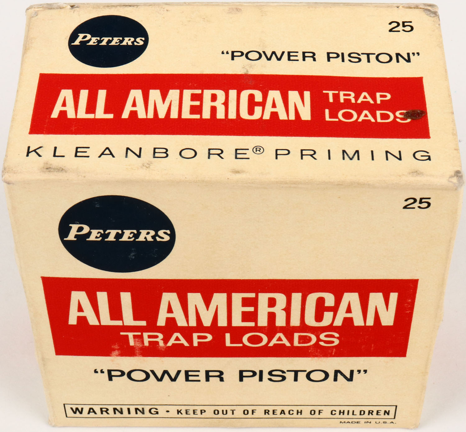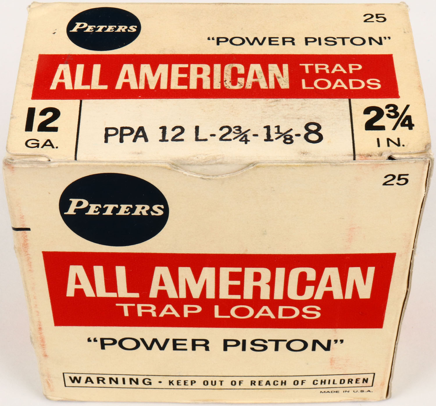 Peters, Trap Loads, 12ga, 2 3/4'', 1pc., Full, shot size 8, box is very solid with great color, Shells are excellent. Grade: Excellent ++ - Value: 10 to 30