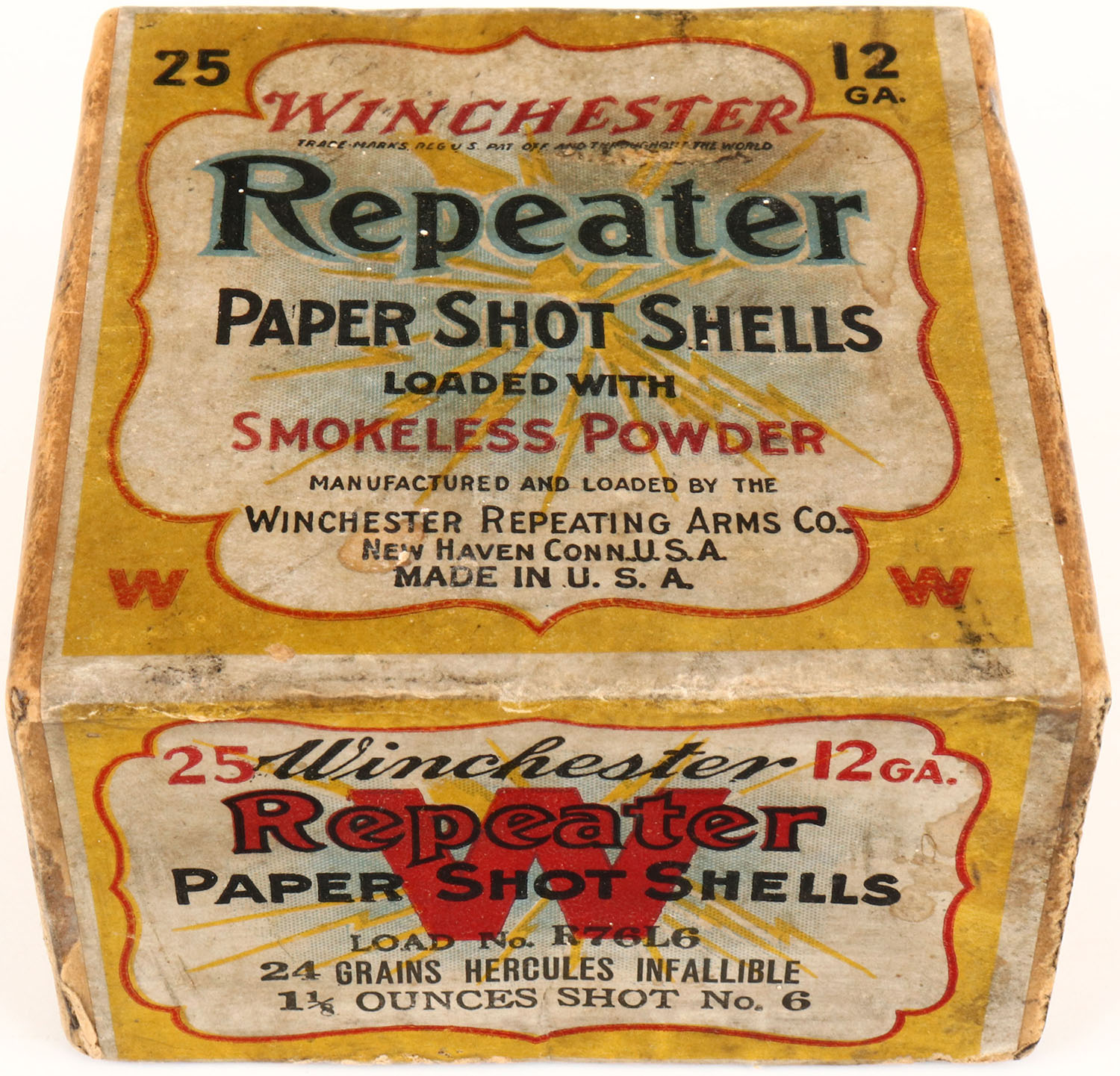 Winchester, REPEATER, 12 Gauge, 2pc., Empty., Shot Size 6, Buff box with yellow, white & red label showing lightning bolt, box is solid with small shell protrusion, light age soiling and nice label. Grade: Very Good ++ - Value: 50 to 200