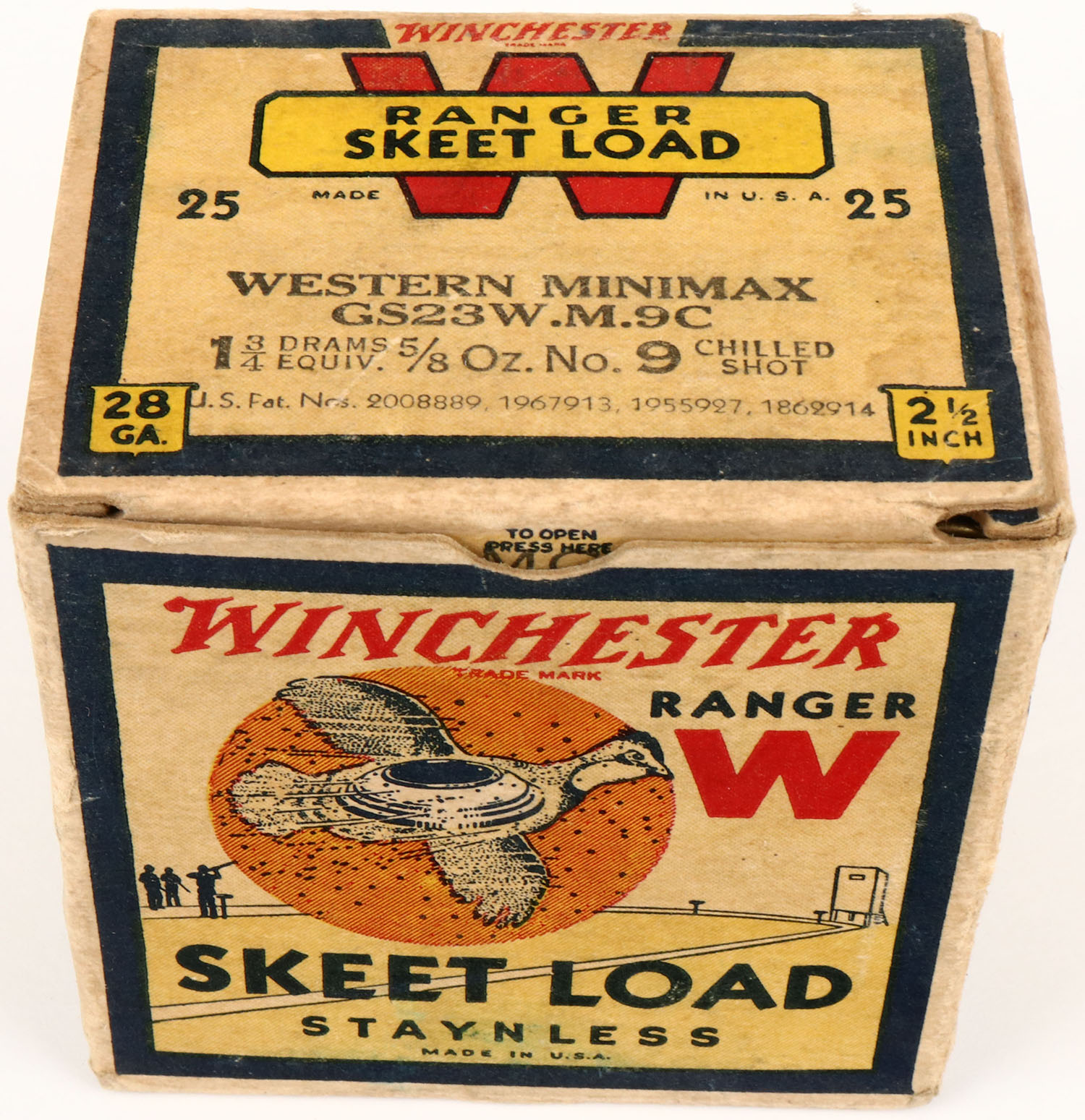Winchester, RANGER SKEET LOAD WESTERN MINIMAX, 28ga, 1pc., Full, White, blue & red box that pictures flying Quail with skeet in body & shot all around, Staynless, 2 1/2'', Loading: 1 3/4 Drams 5/8 Oz. 9 Chilled Shot, Box is very solid with nice colors, Shells are poor. RARE BOX. Grade: Excellent - Value: 200 to 600