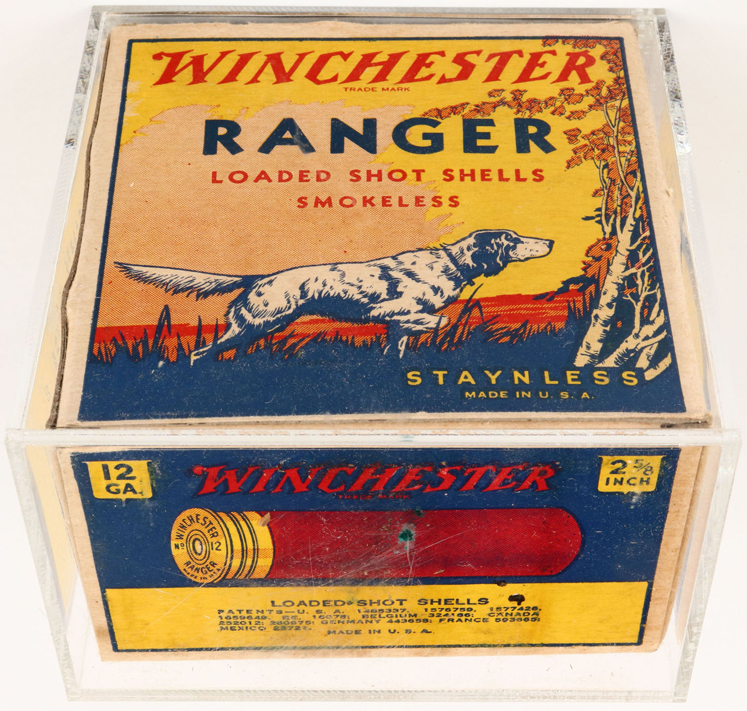 Winchester, Ranger with nice Display Acrylic Box, 12 Gauge, 1pc., Full, Shot Size 6, multi colored box, dog on point, shells 2 5/8'', box has shell protrusion with great colors, shells are very good. Grade: Excellent + - Value: 40 to 100