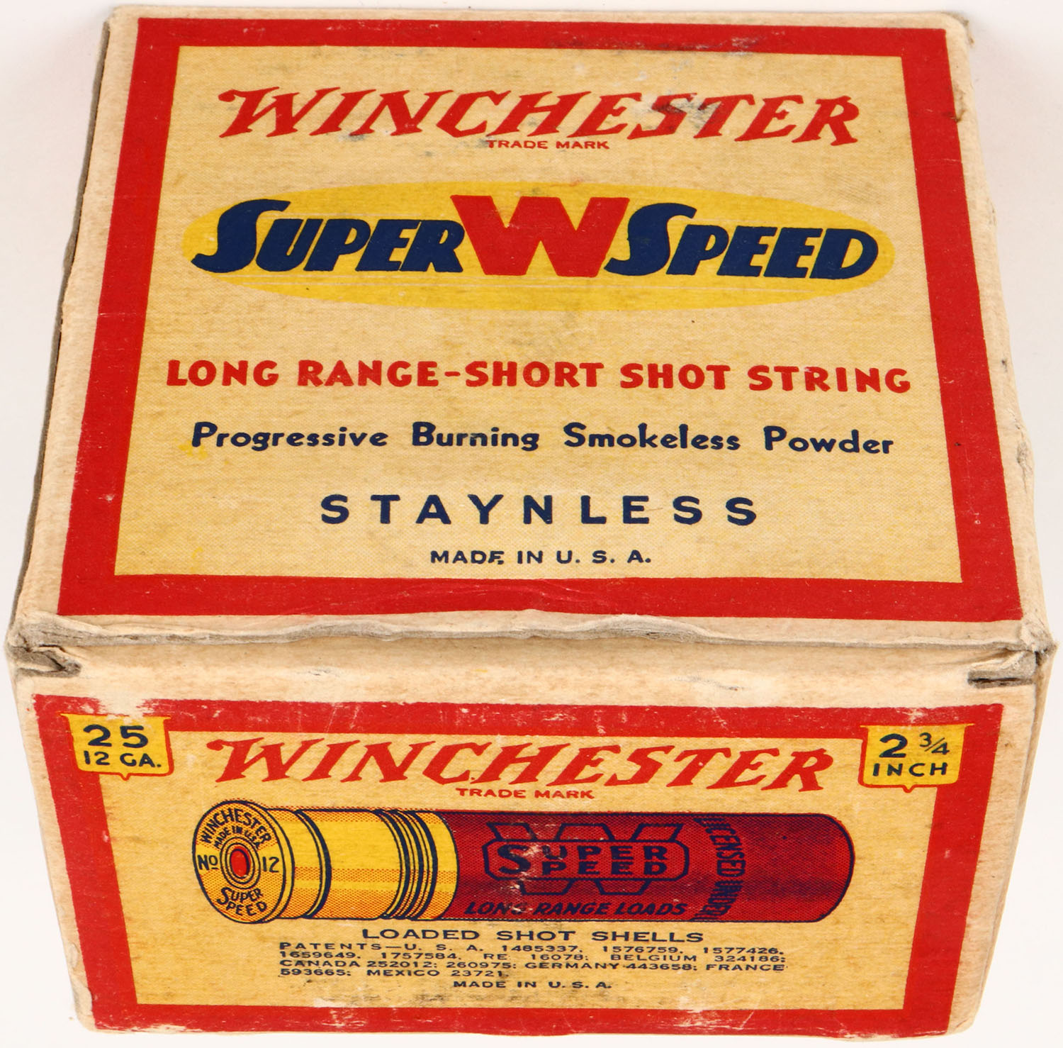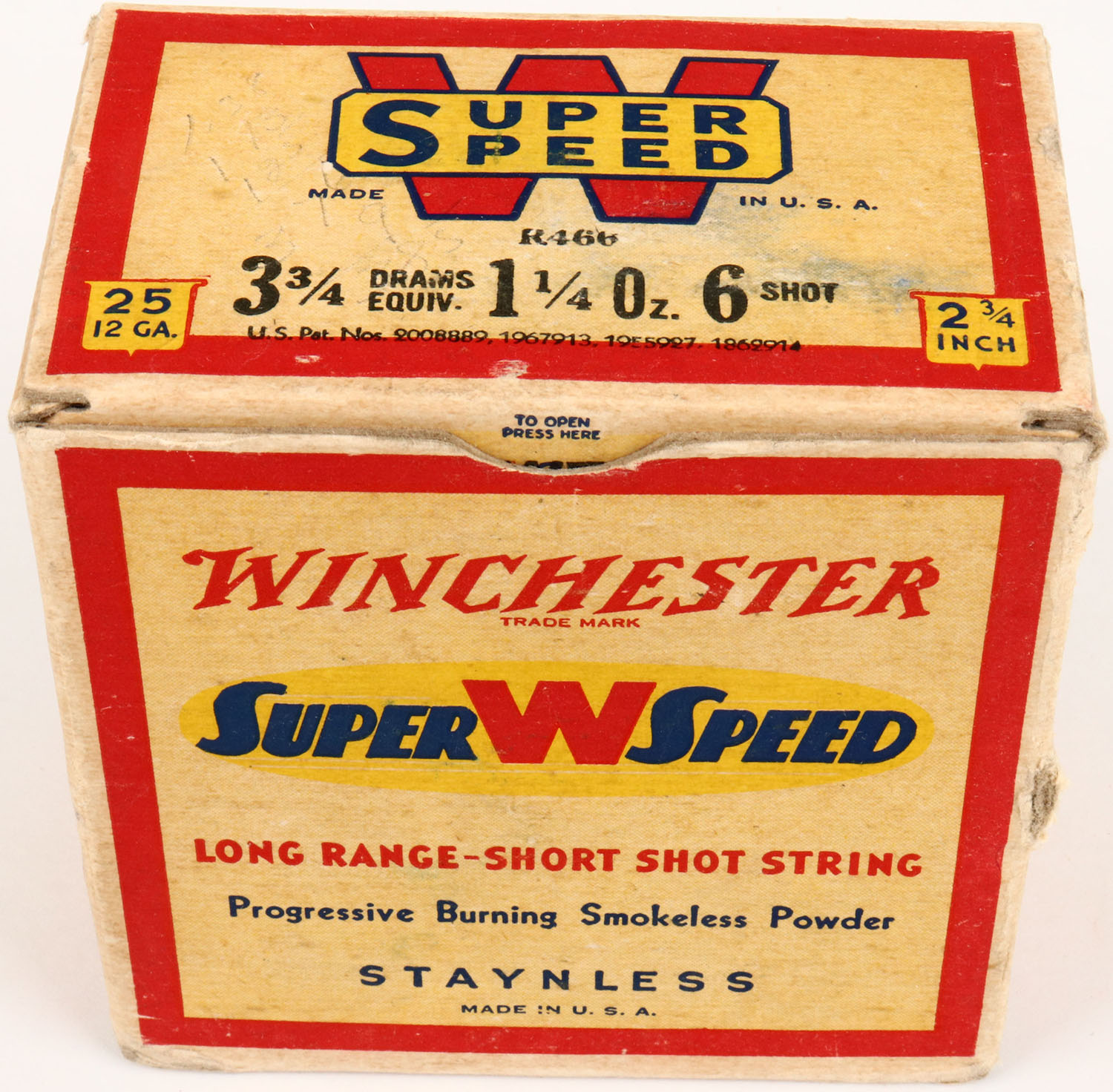 Winchester, Super W Speed, 12ga., Staynless, 2 3/4 in., 1pc., Full, shot size 6, cream red, blue and yellow box, box is solid has small shell protrusion with good colors, shows light age spoiling, shells are excellent. Grade: Very Good ++ - Value: 20 to 60