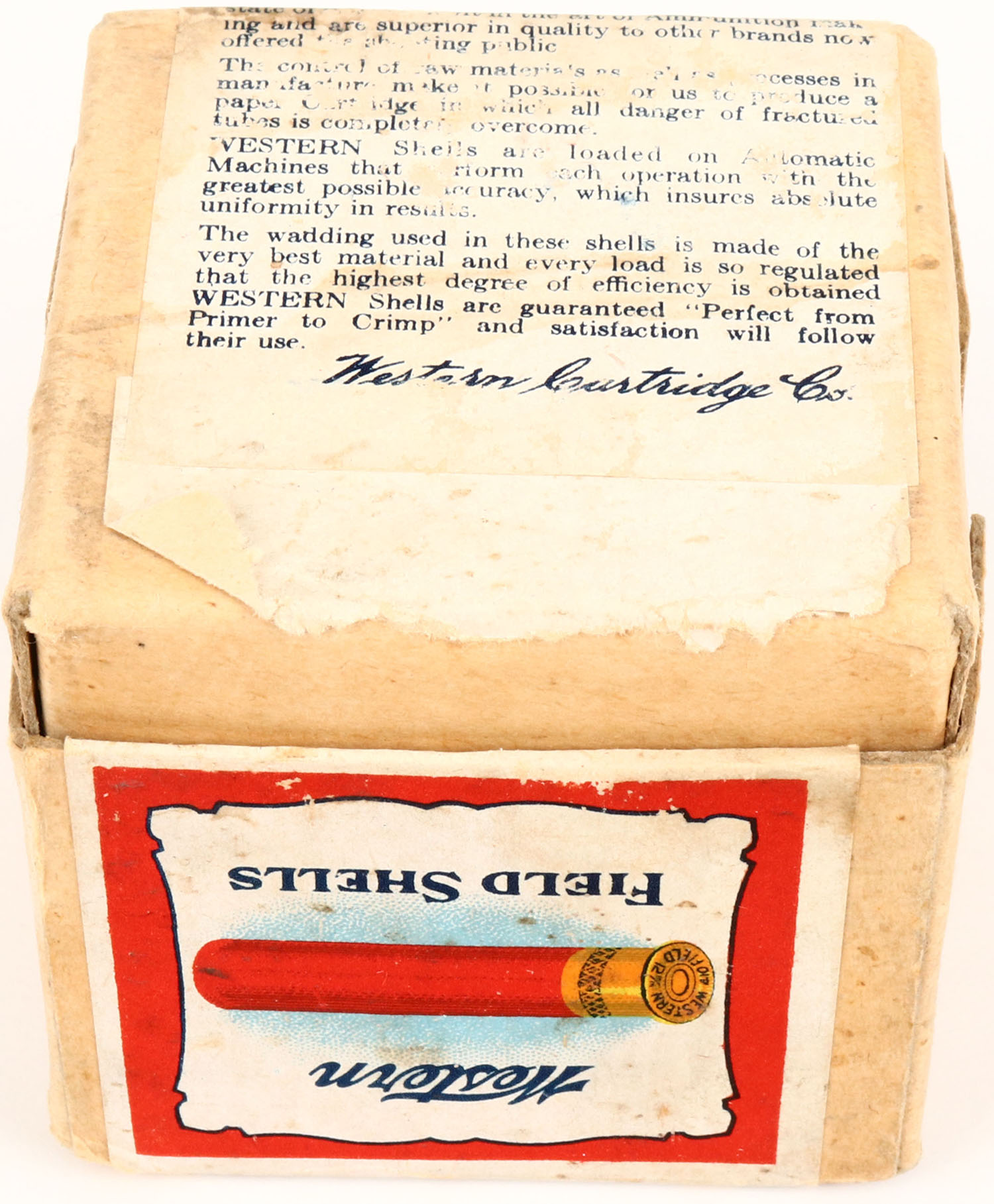 Western, Field/Super X, Label was made during transition from Field boxes to Super X boxes. 410ga., 2pc, Full, shot size 7 1/2 CH, box has seam split with age soiling. Grade: Excellent - Value: 100 to 300