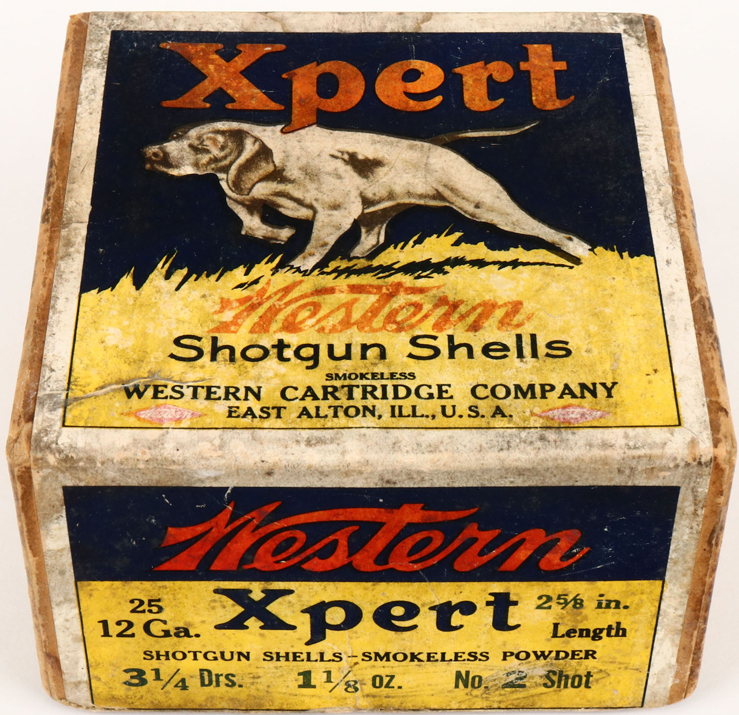 Western Cart. Co., Xpert, has Super-X bottom, 12ga., 2pc., Empty, blue, yellow & red box with a dog on point, Loading: No. 2 Shot, box has age soiling with nice colors. Grade: Very Good ++ - Value: 20 to 100