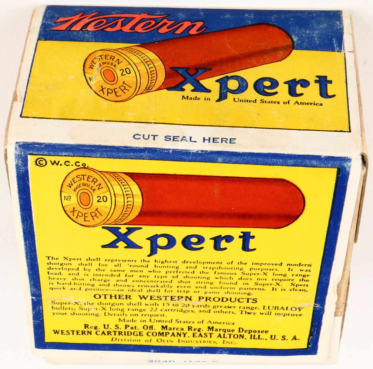 Western, Xpert, 20ga., 2pc., Full, Shot Size (not loaded in the USA) ? Shot, 2 1/2in., buff box with blue & yellow paper label that pictures the pointer, box has seam split, shell protrusions, label isn't glued to box but is solid with light scuffing to top label, label is 100% intact. Grade: Excellent - Value: 50 to 200