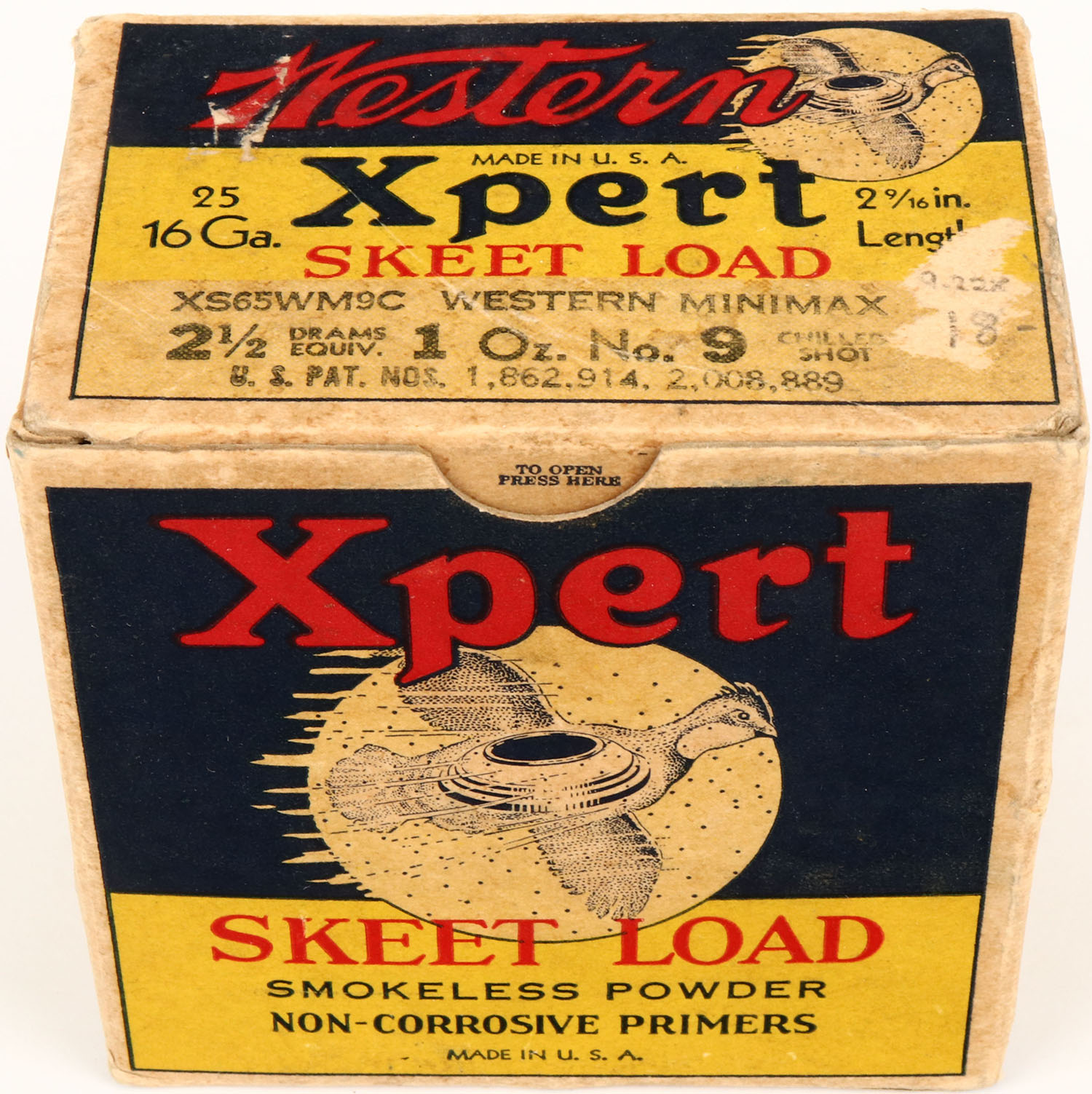 Western Xpert, SKEET LOAD with two inserts, 16ga., 1pc., Partial 22rds, white, blue & red box that pictures flying Quail with skeet in body & shot all around, Loading: 2 1/2 Drams 1 Oz. No. 9 Chilled Shot, box is solid with light scuffing to top & inside flap has part torn off and very nice colors, shells are excellent. Grade: Excellent + - Value: 100 to 300