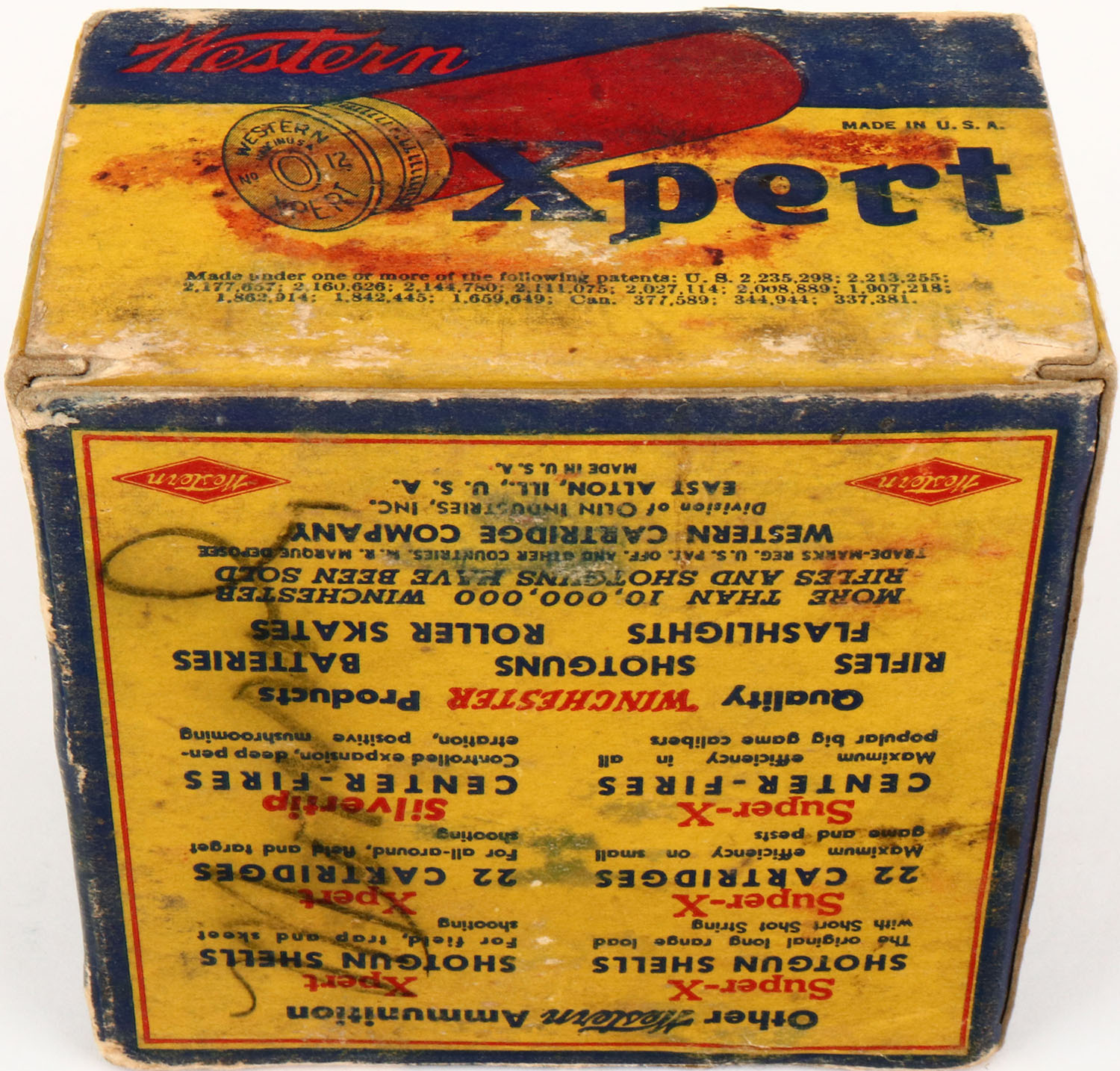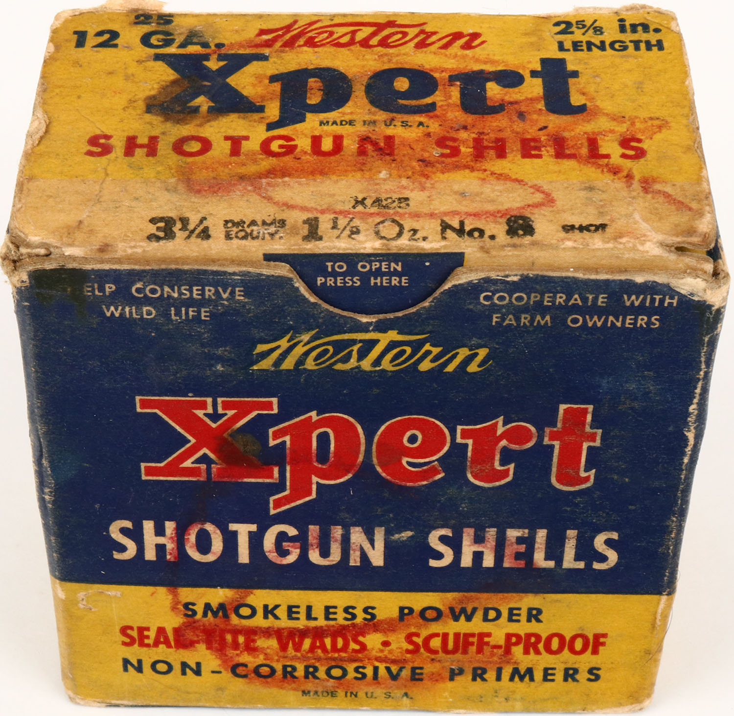 Western, Xpert, 12ga., 2 5/8'', 1pc., Partial 20rds, shot size 8, yellow, blue & red box, box is solid with soiling, and nice colors, shells are very good. Grade: Very Good - Value: 6 to 20