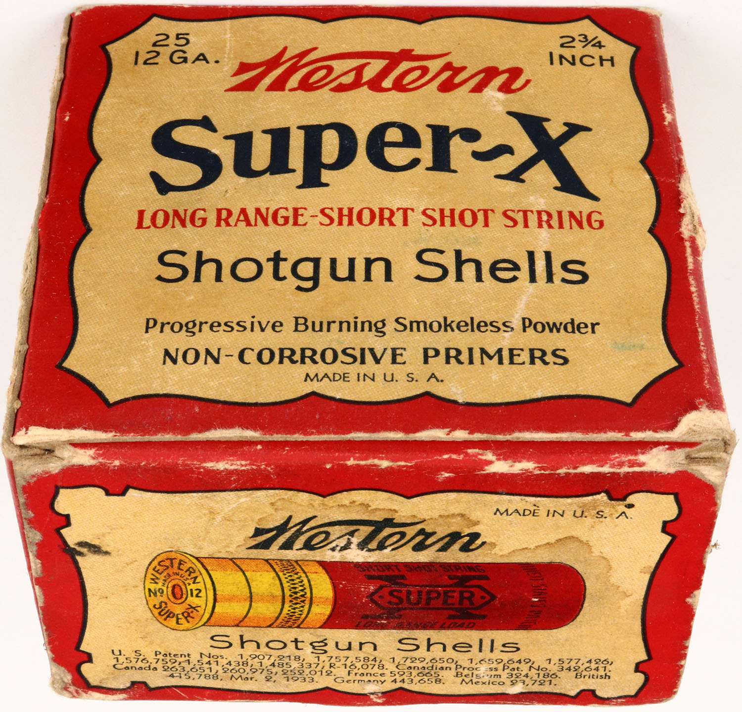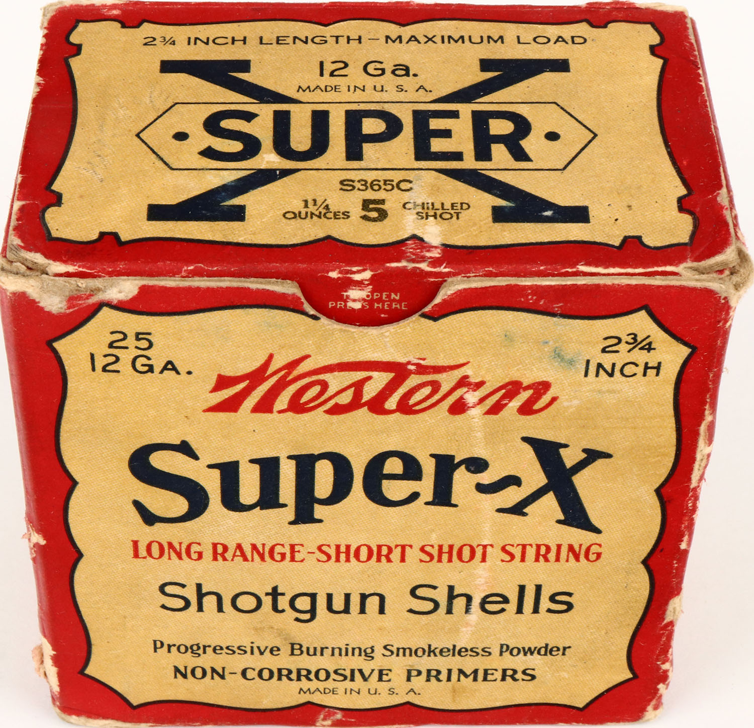 Western, Super X with insert, 12ga., 1pc, Partial 24rds, 2 3/4'', shot size 5 Chilled Shot, box has torn inside flap, edge wear, light age soiling, and shells are fair. Grade: Very Good + - Value: 10 to 30