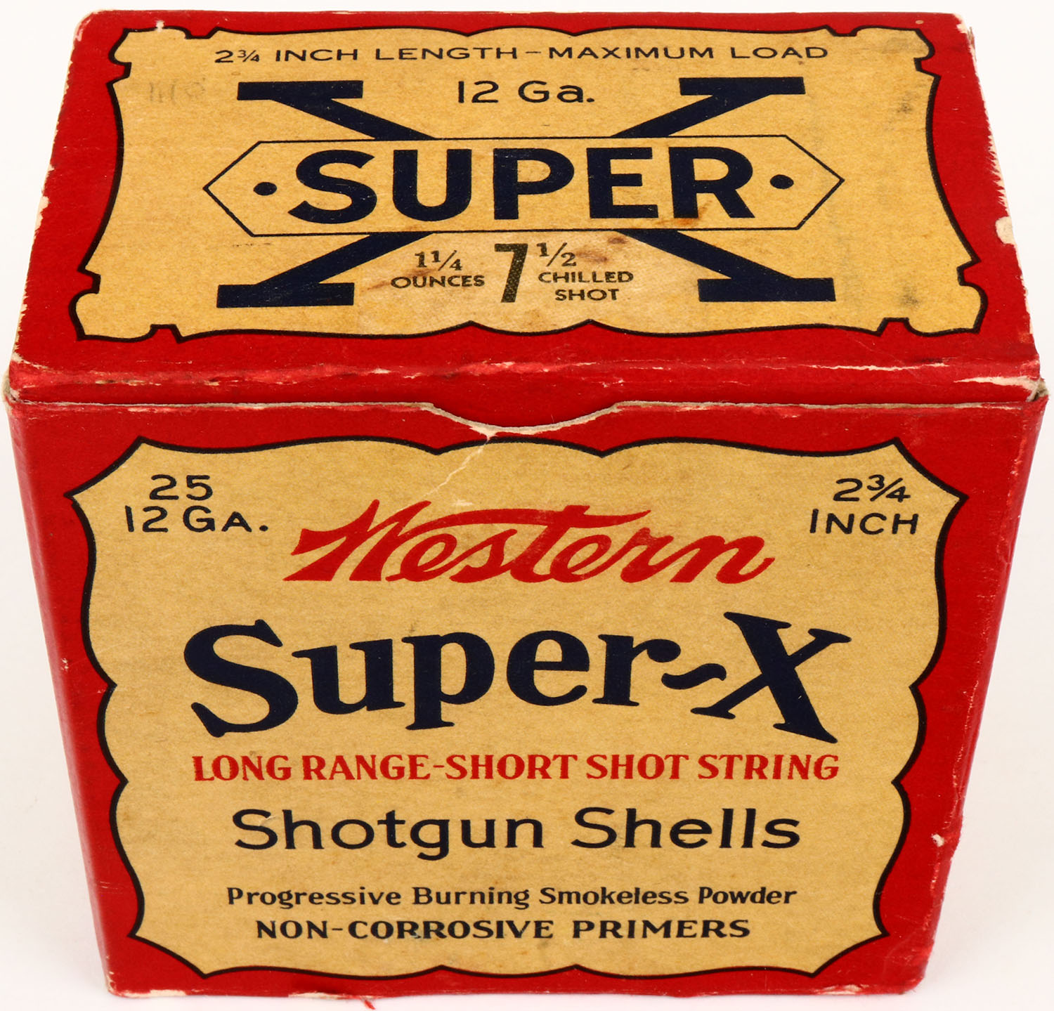 Western Cart. Co., Super X, 2 3/4'', 12ga., 1pc., Empty, 7 1/2 Chilled Shot, red, buff & black box, box is solid with very nice colors, box has light edge wear. Grade: Very Good ++ - Value: 20 to 40