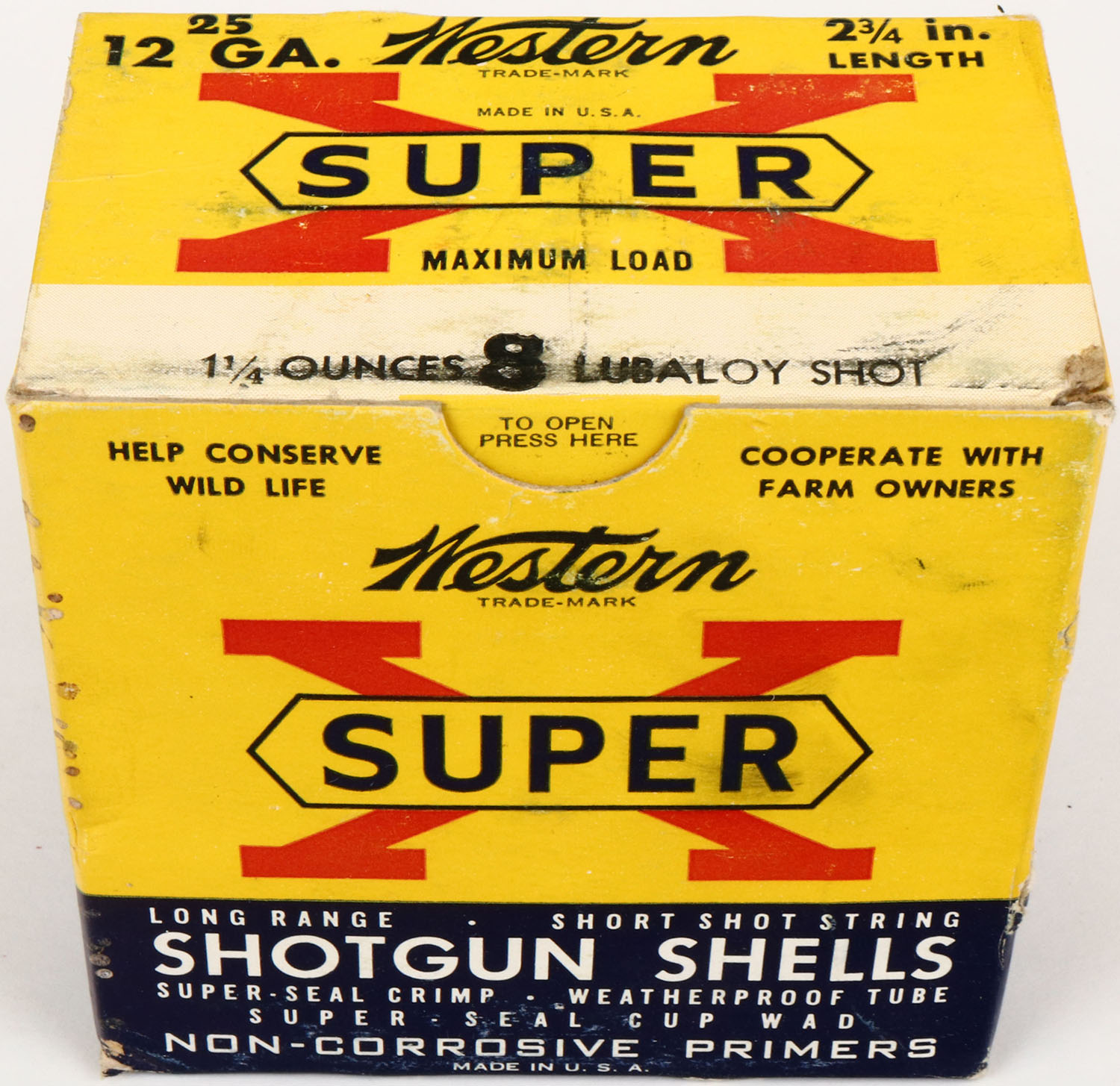 Western, Super X, 12 ga., 2 3/4'', 1pc., Full, shot size 8 Lubaloy, yellow, blue & red box, box is solid with light soiling, shells are excellent. Grade: Excellent + - Value: 10 to 30