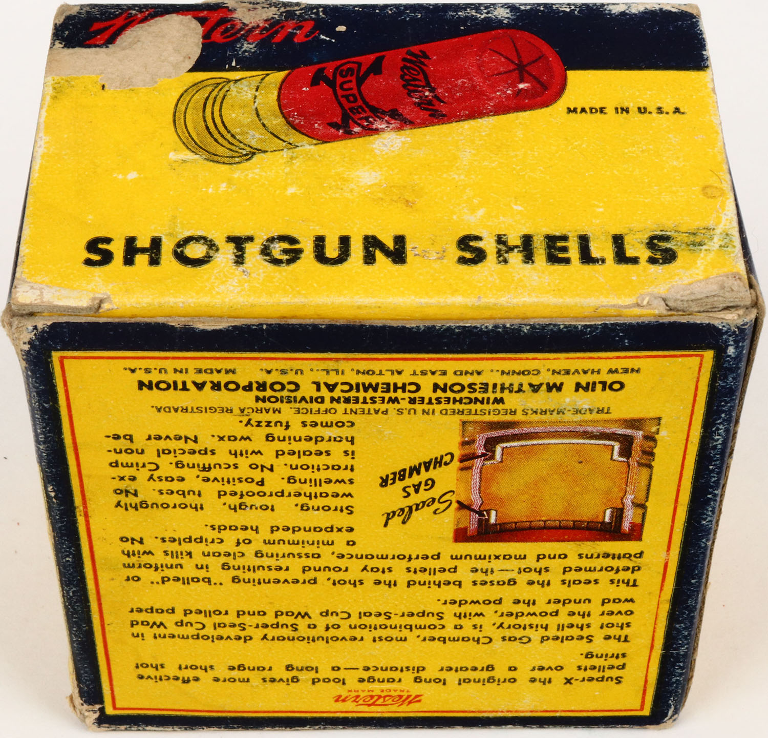 Western, Super X, 16 ga., 2 3/4'', 1pc., Full, shot size 5, yellow, blue & red box, box is solid with light soiling and light scuffing to bottom, shells are very good. Grade: Excellent - Value: 10 to 30