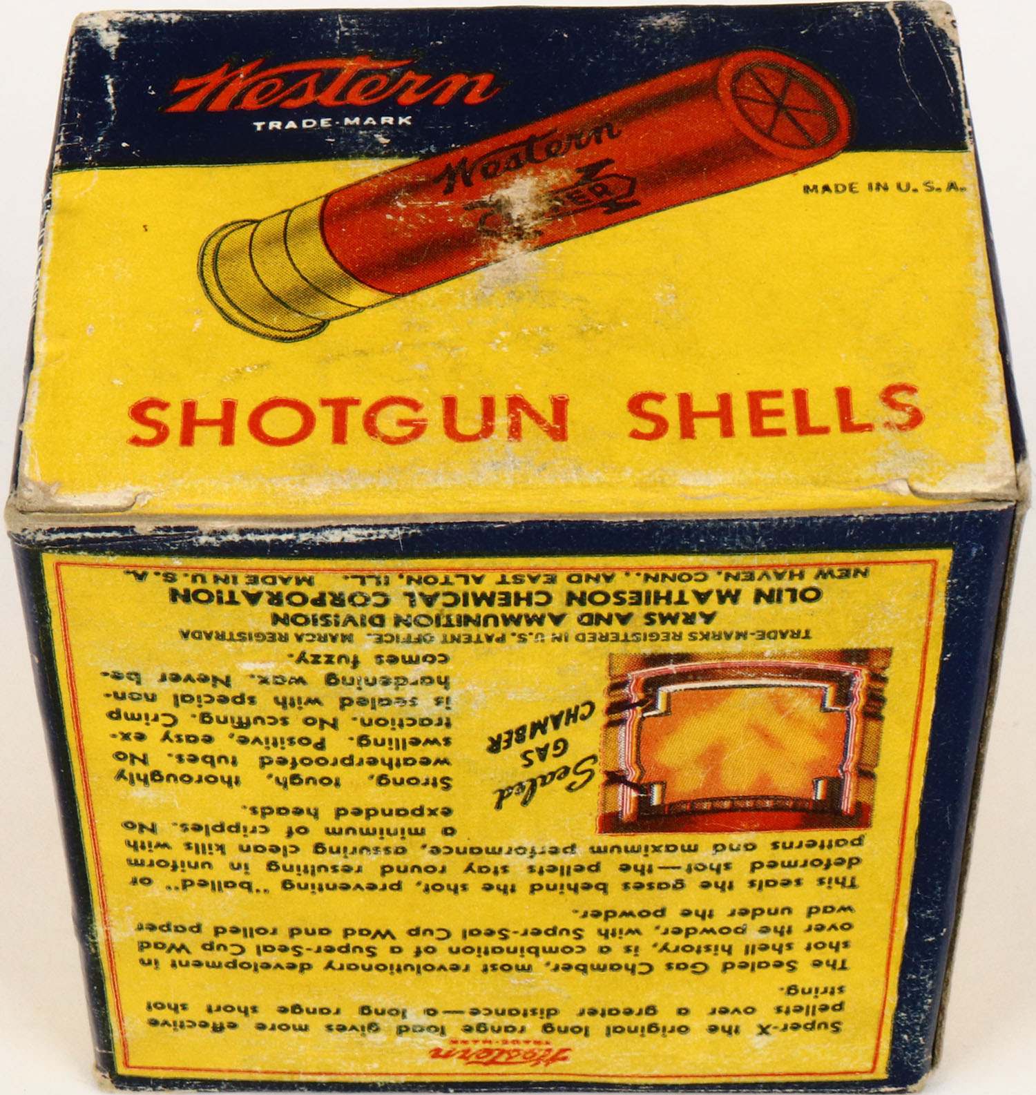 Western, Super X, 28 ga., 2 3/4'', 1pc., Full, 6 Shot, yellow, blue & red box, box is solid with light age soiling, shells are excellent. Grade: Very Good ++ - Value: 16 to 30