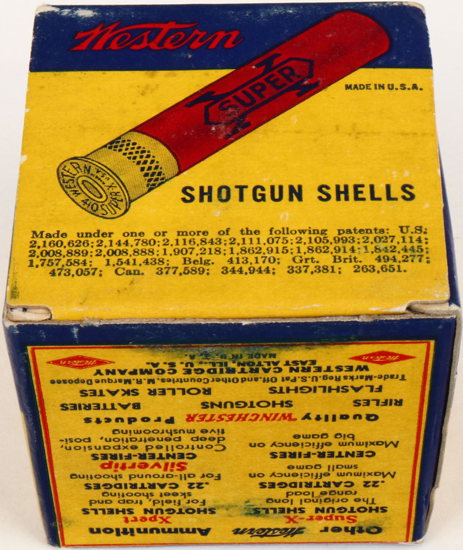 Western, Super X, 410ga., 2 1/2'', Single Ball, 1pc., Full, yellow, blue & red box, box is solid with age soiling and part of flap is missing but nice color, shells are very good. Grade: Very Good + - Value: 18 to 40