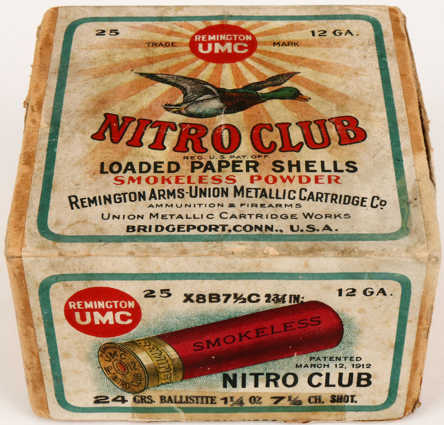 REM U.M.C. Nitro Club, 12 GAUGE, 2pc., Full, shot size 7 1/2 CH, buff box with sunburst logo & Mallard flying on top, has very nice color to label, box has seam split with shell protrusions and light age soiling, shells are excellent. Grade: Excellent - Value: 70 to 200