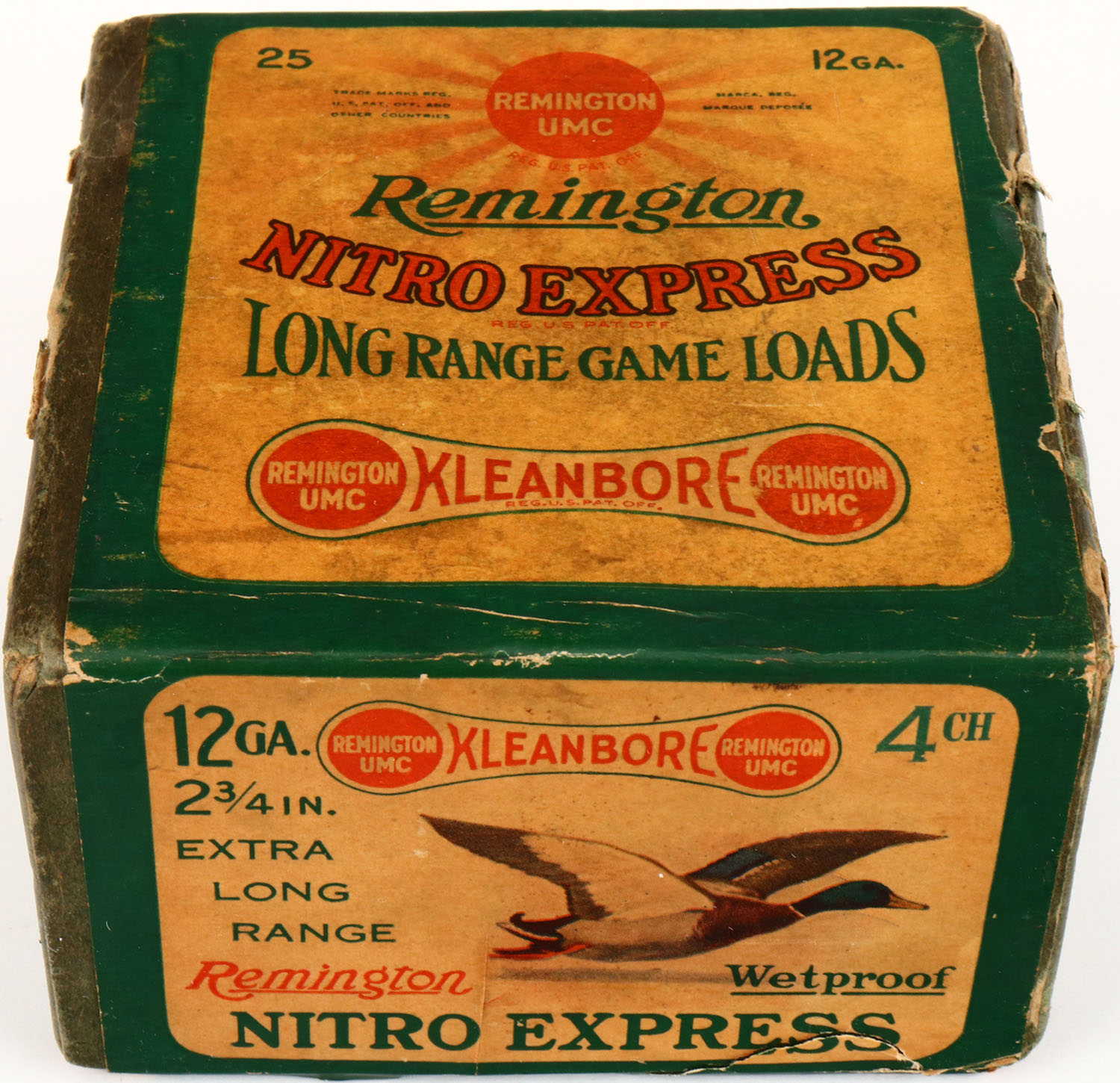Remington Nitro Express, Long Range Game Loads, pictures Mallard in flight, 12ga., 2pc., Full, shot size 4CH, green box with sunburst logo & MALLARD on side, box has seam splits, age soiling and very nice colors to label. Grade: Very Good + - Value: 50 to 200