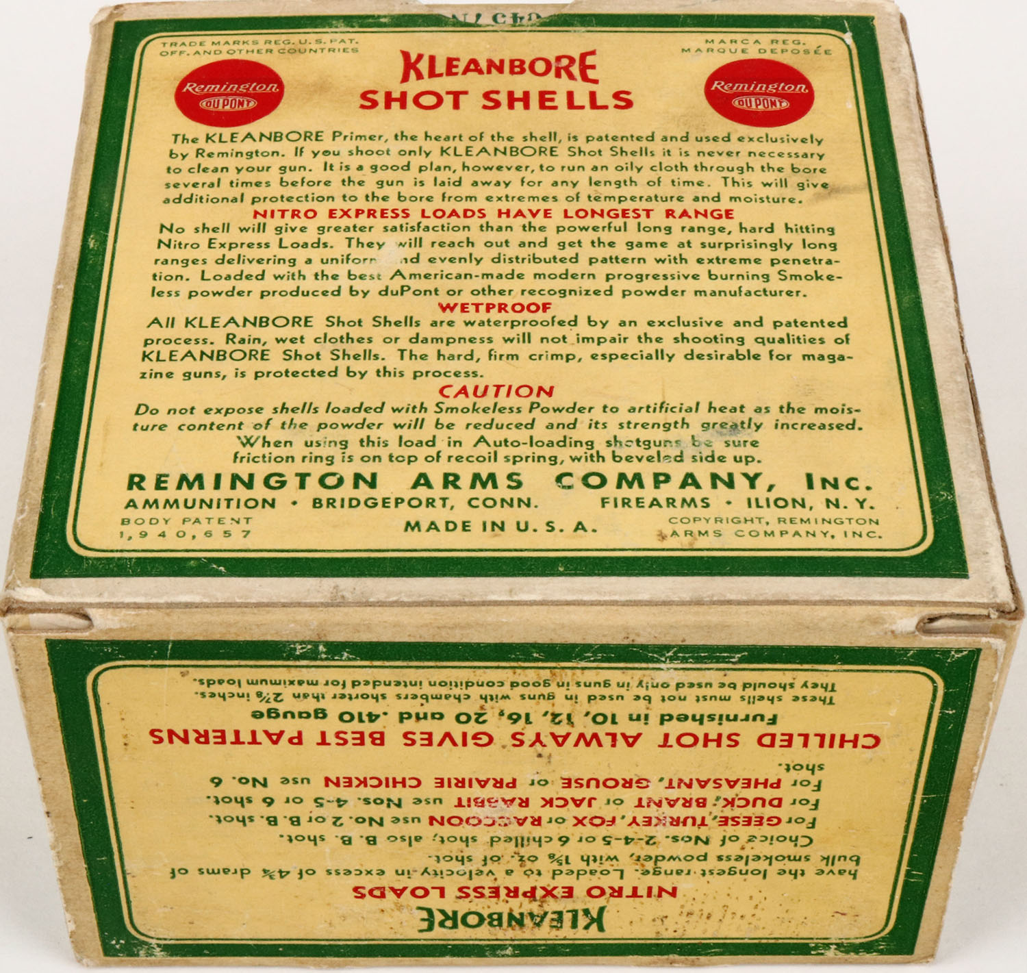 Remington, Kleanbore, NITRO EXPRESS, 10ga., 1pc., Full, shot size 4C, box is yellow, red and green, box is solid, has light soiling with very nice colors, shells are excellent. Grade: Excellent + - Value: 20 to 80